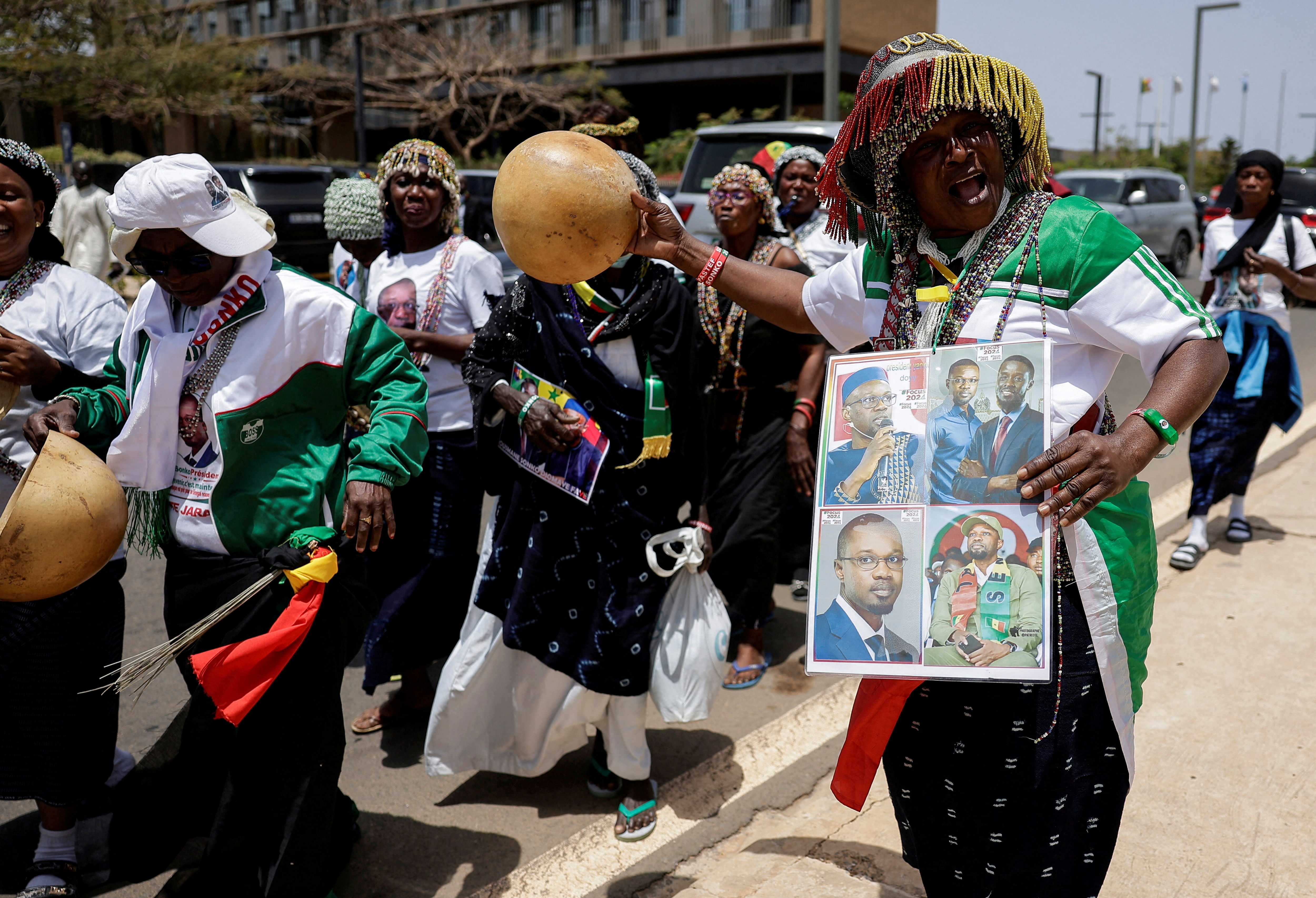 第1项,共3项 支持者在塞内加尔新当选总统巴西鲁·迪奥马耶·法耶于2024年4月2日在达喀尔的就职仪式上宣誓就职后庆祝。路透社/Zohra Bensemra/档案照片