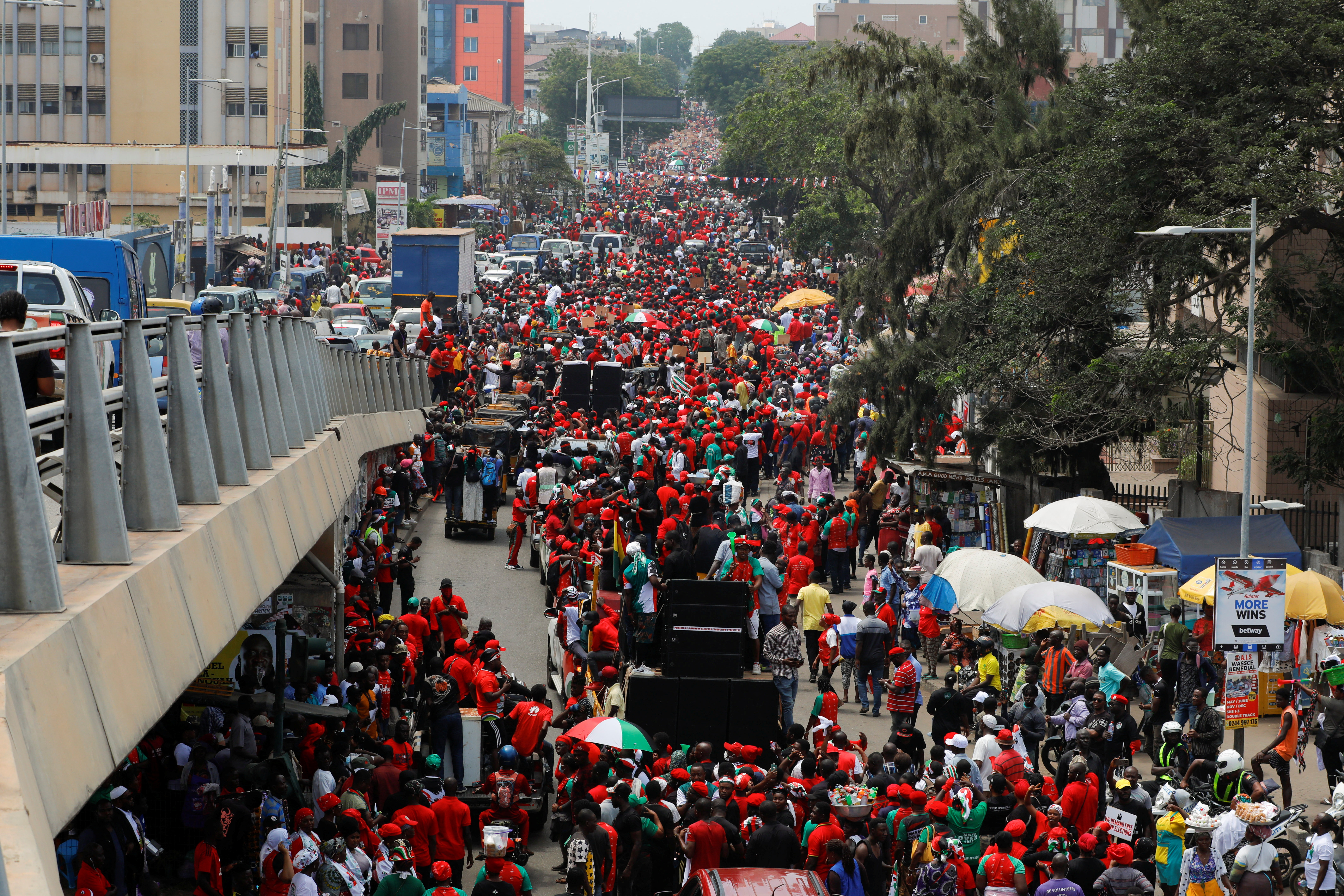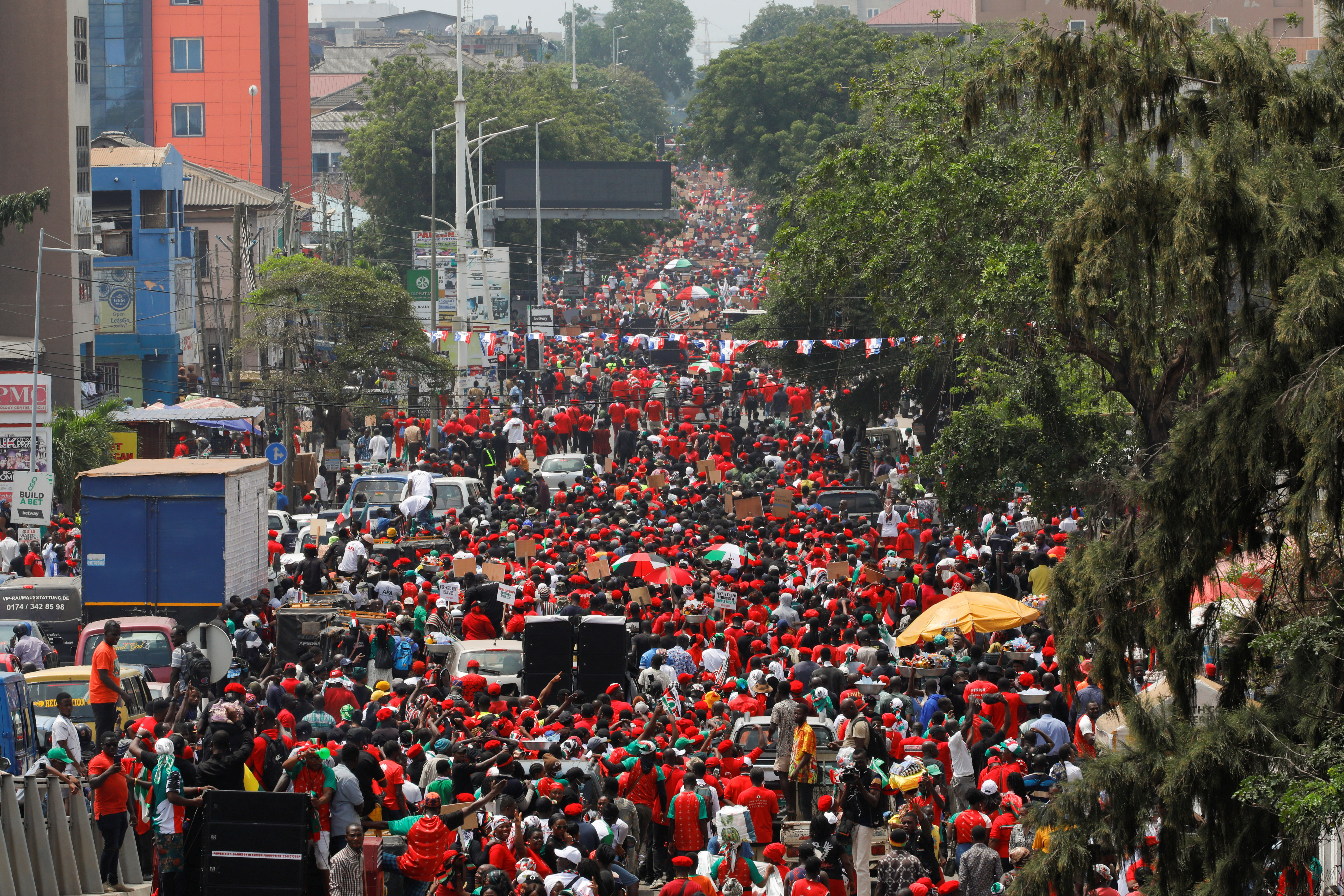 身穿红黑相间的服装,数千名支持者在首都阿克拉的主要街道上游行,扬声播放雷鬼音乐和竞选歌曲,并呼吁国际机构、加纳和平委员会以及宗教和公民社会团体进行干预。
