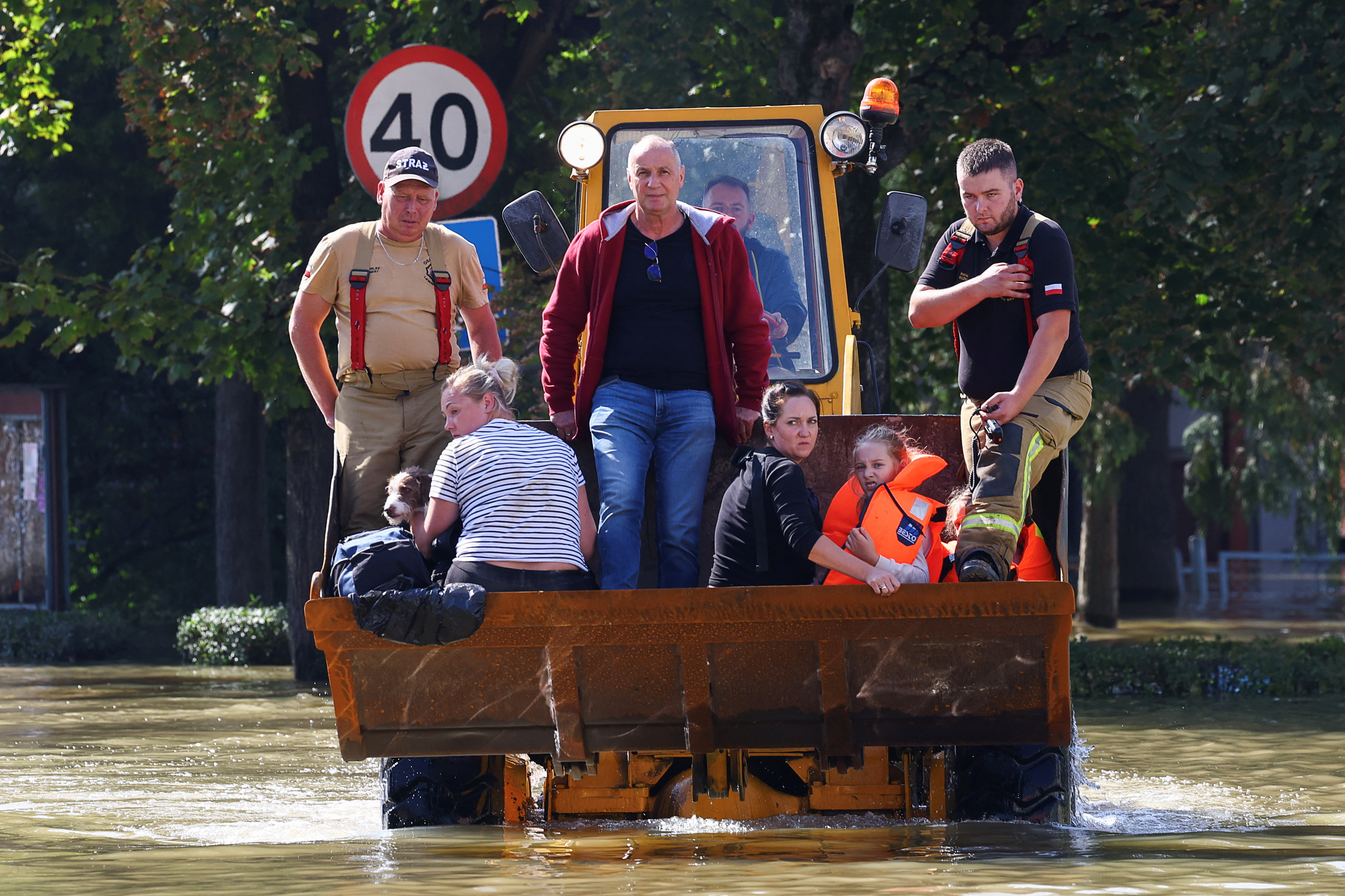 第1项,共5项 洪水受灾居民从被尼萨克劳兹卡河淹没的地区撤离,因强降雨,地点在波兰的莱温布热斯基,2024年9月17日。路透社/Kacper Pempel