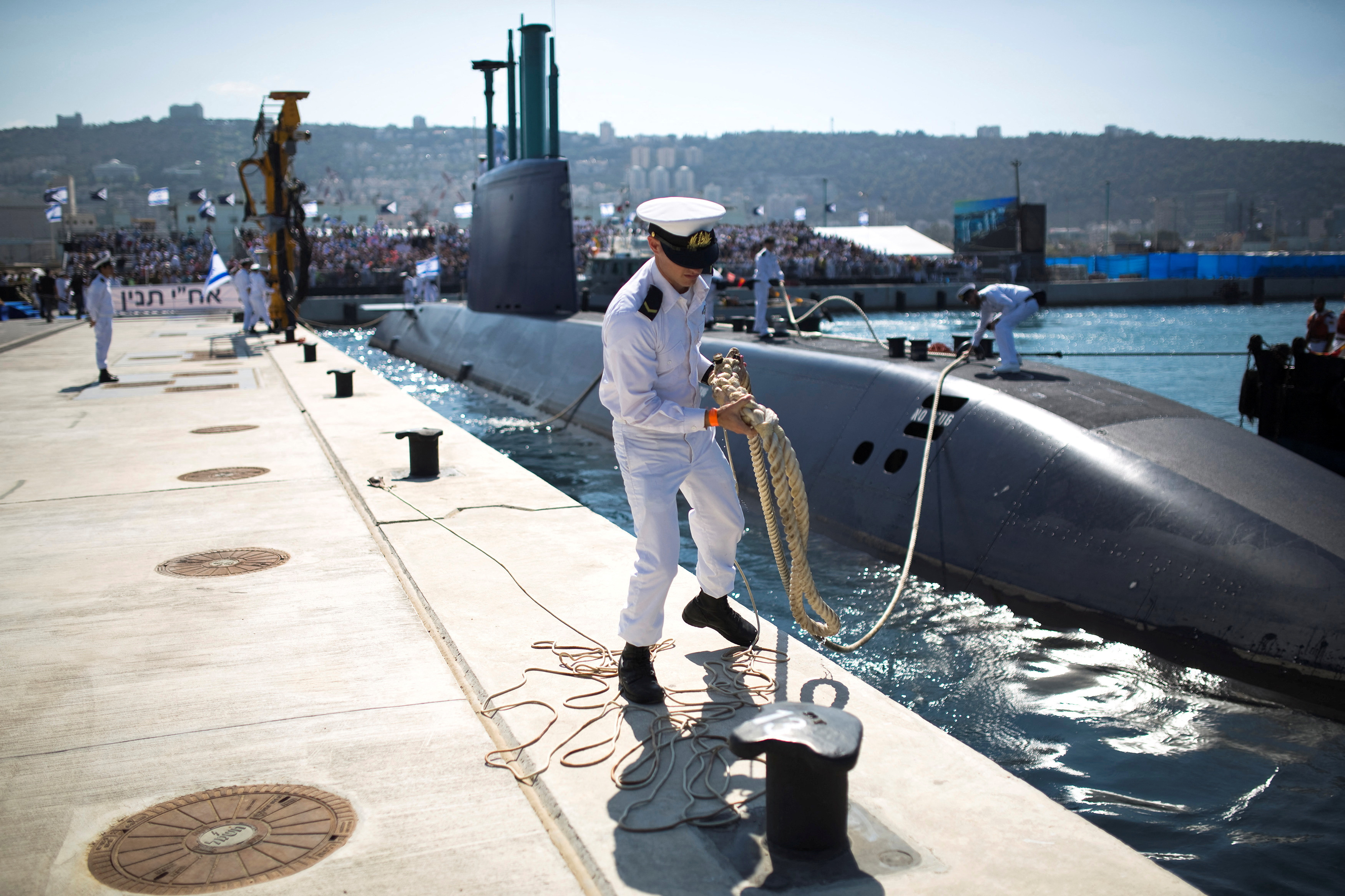 第1项,共2项 一名以色列海军军官握着INS Tanin的系船绳,这是一艘德国制造的Dolphin AIP级潜艇,在2014年9月23日抵达以色列后停靠在北部城市海法的海军基地。路透社/阿米尔·科恩/档案照片