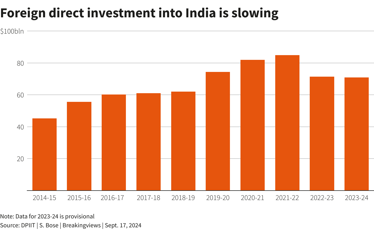 流入印度的外国直接投资自2022年3月底以来一直在下降:https://dpiit.gov.in/sites/default/files/fdi%20factsheet%20june%202024.pdf