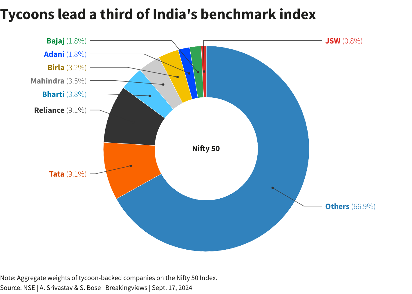 印度的富豪支持的公司占基准Nifty 50指数的三分之一: https://www.niftyindices.com/indices/equity/broad-based-indices/NIFTY-Next-50/NIFTY-50