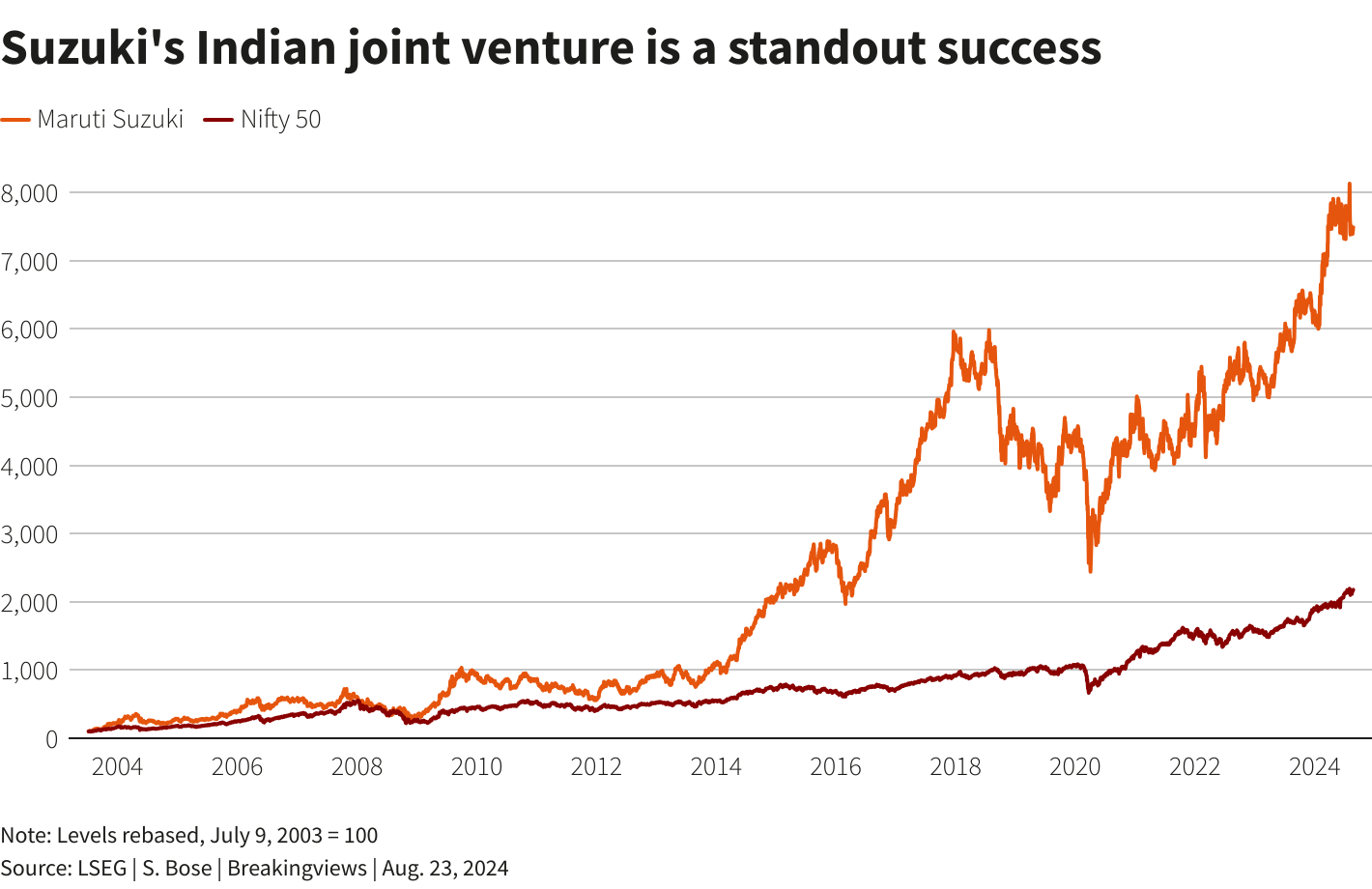 在新德里禁止Shein应用程序四年后,这家成立于中国的快时尚公司再次与安巴尼的2400亿美元的信实工业公司建立合作关系。他们计划共同数字化该集团零售商的供应链,制造商品并将其出口到全球。同样,在印度对中国汽车巨头上汽集团的当地单位发起调查不到两年后,该公司于3月完成了一项合资企业,与萨贾恩·金达尔的JSW集团合作销售其MG品牌汽车。新到货至少有一些成功的外国合资企业在印度可以效仿。以460亿美元的马鲁蒂铃木 (MRTI.NS)为例,它占据了该国40%的汽车市场。这与日本铃木汽车的合作 (7269.T)在过去十年中为股东提供了年度回报,包括超过基准Nifty 50指数的股息。与此同时,阿达尼威尔玛 (ADAW.NS),阿达尼集团与新加坡威尔玛的合作 (WLIL.SI),成立于25年前,是印度 销量最大的食用油品牌。