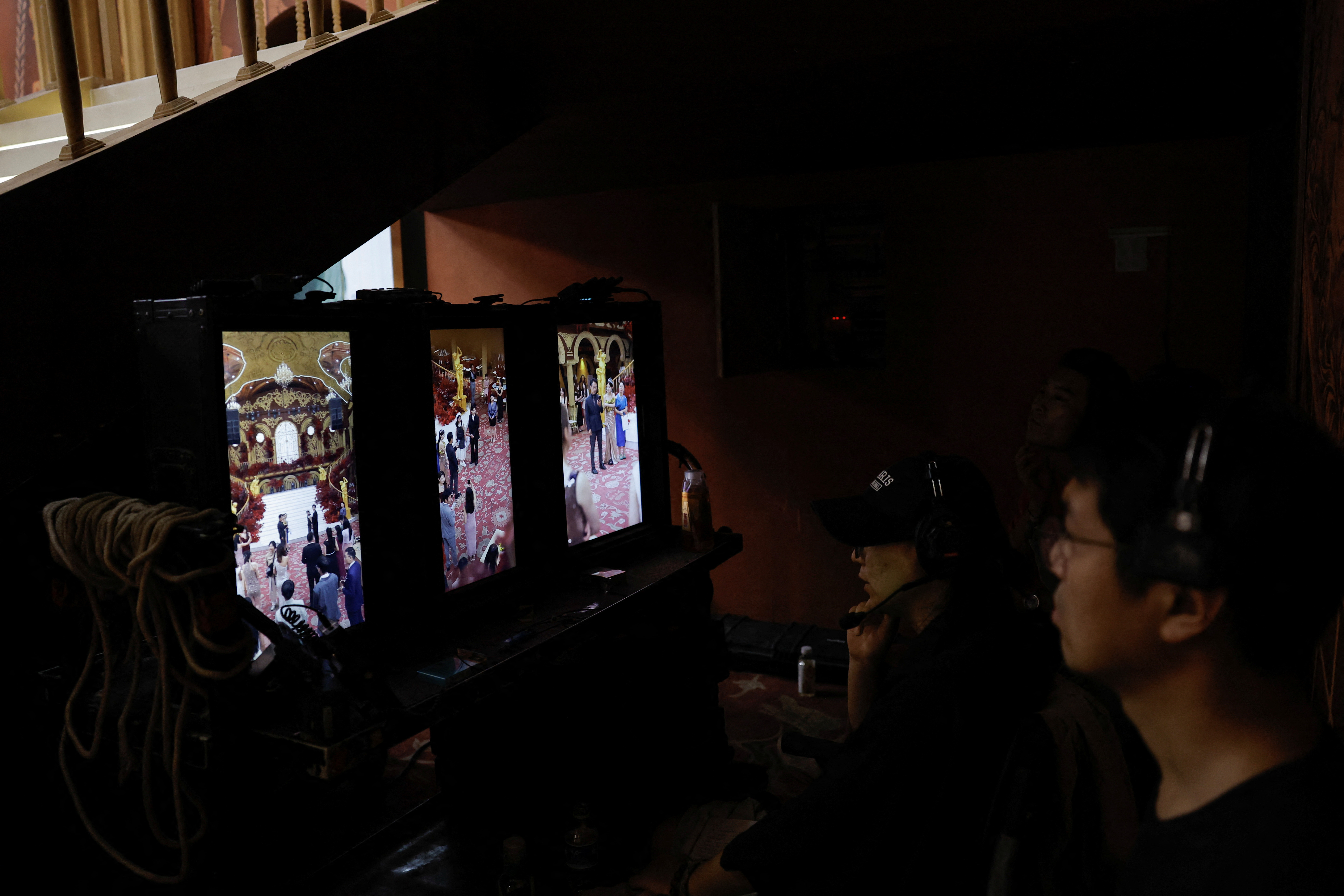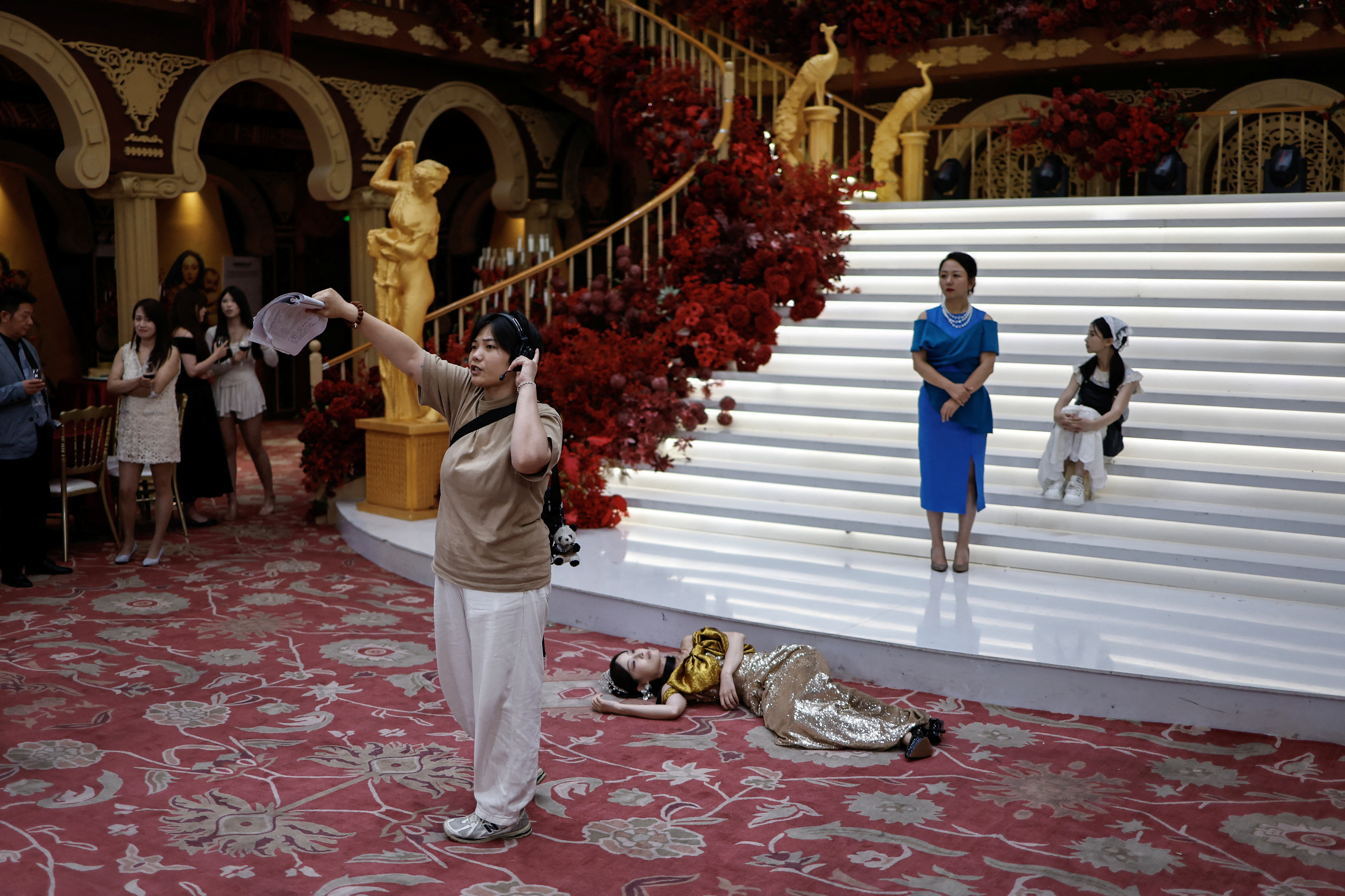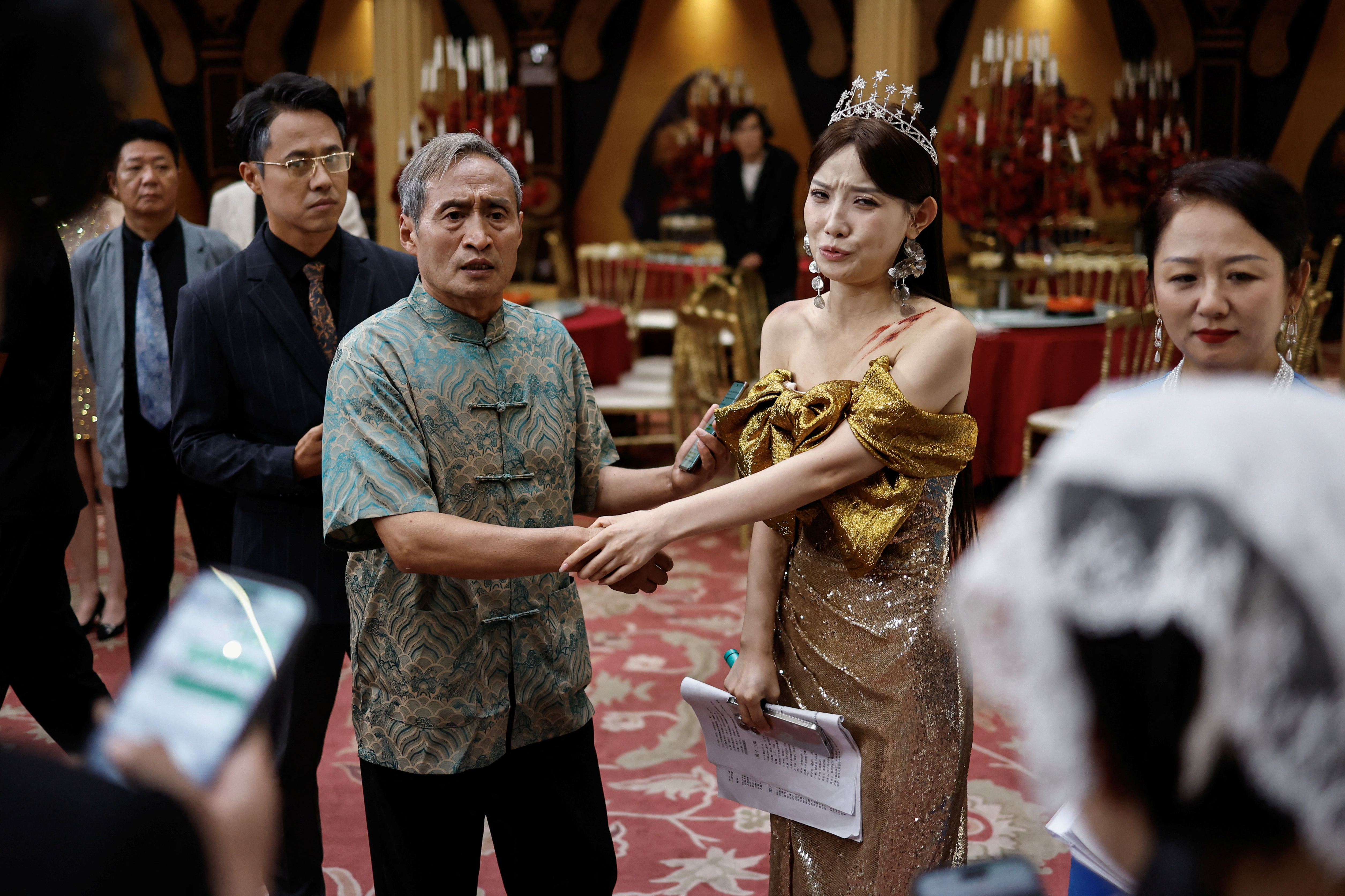 第1项,共5项 演员朱建,69岁,在中国河南省郑州市的一个宴会厅进行微电影拍摄时,与其他演员排练,时间是2024年7月16日。路透社/丁树旺/档案照片