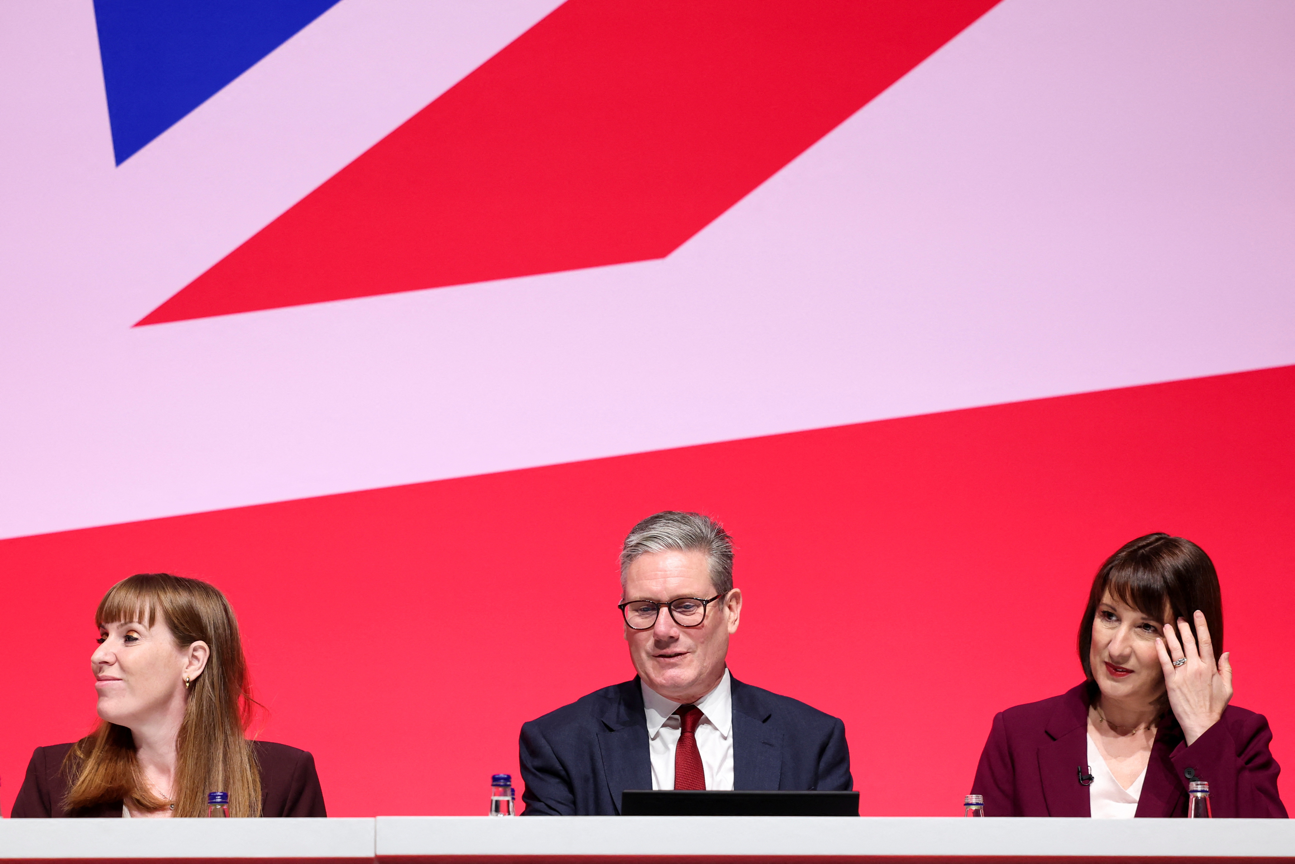 英国副首相安吉拉·雷纳和首相基尔·斯塔默在2024年9月23日于英国利物浦举行的工党年会上鼓掌,英国工党自14年后重新执政的首次聚会。