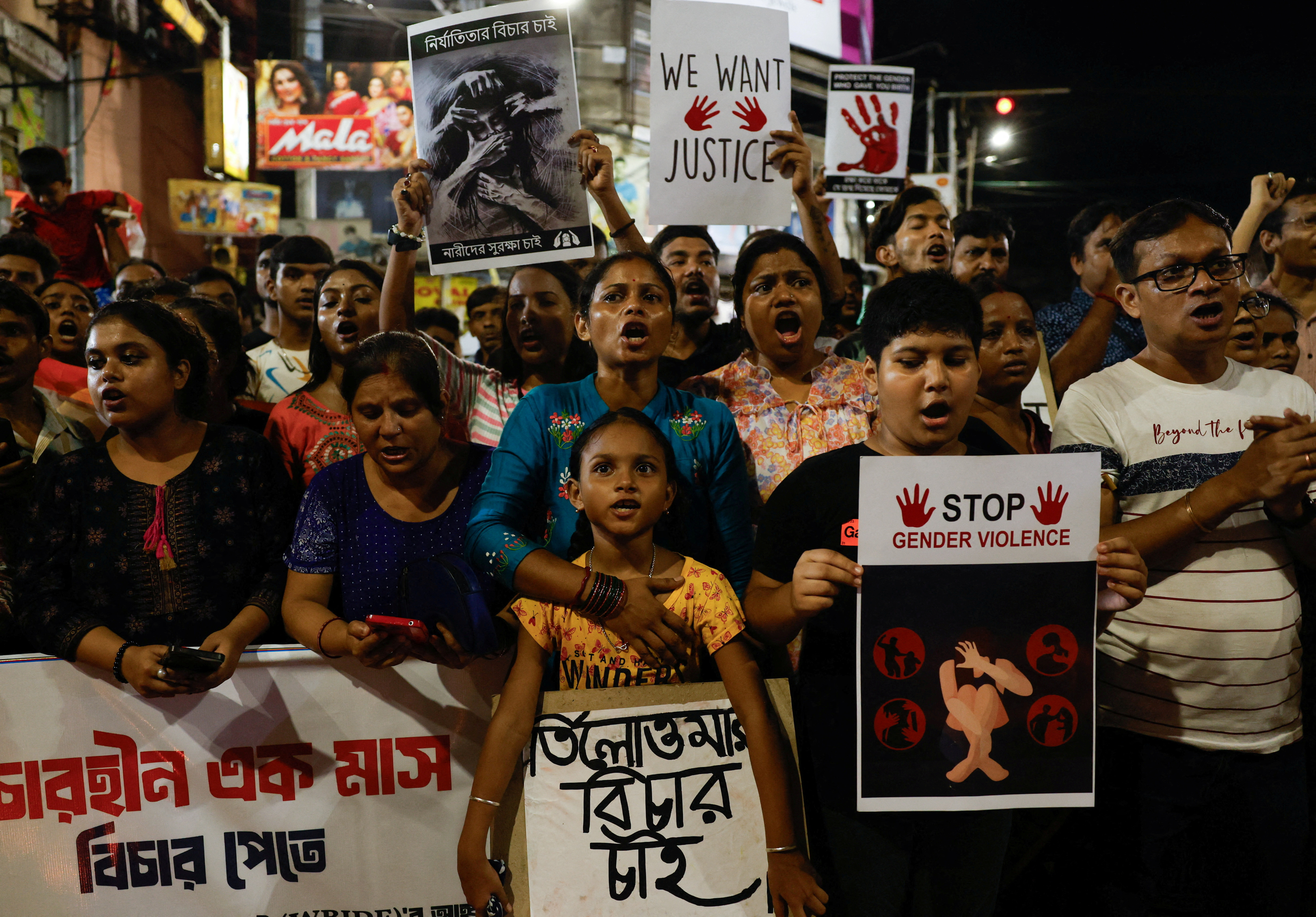 第1项,共3项 人们在抗议活动中高呼口号,谴责并纪念自2024年9月8日在印度加尔各答一家政府医院发生的实习医生强奸和谋杀事件一个月以来的情况。路透社/萨希巴·查瓦德里/档案照片
