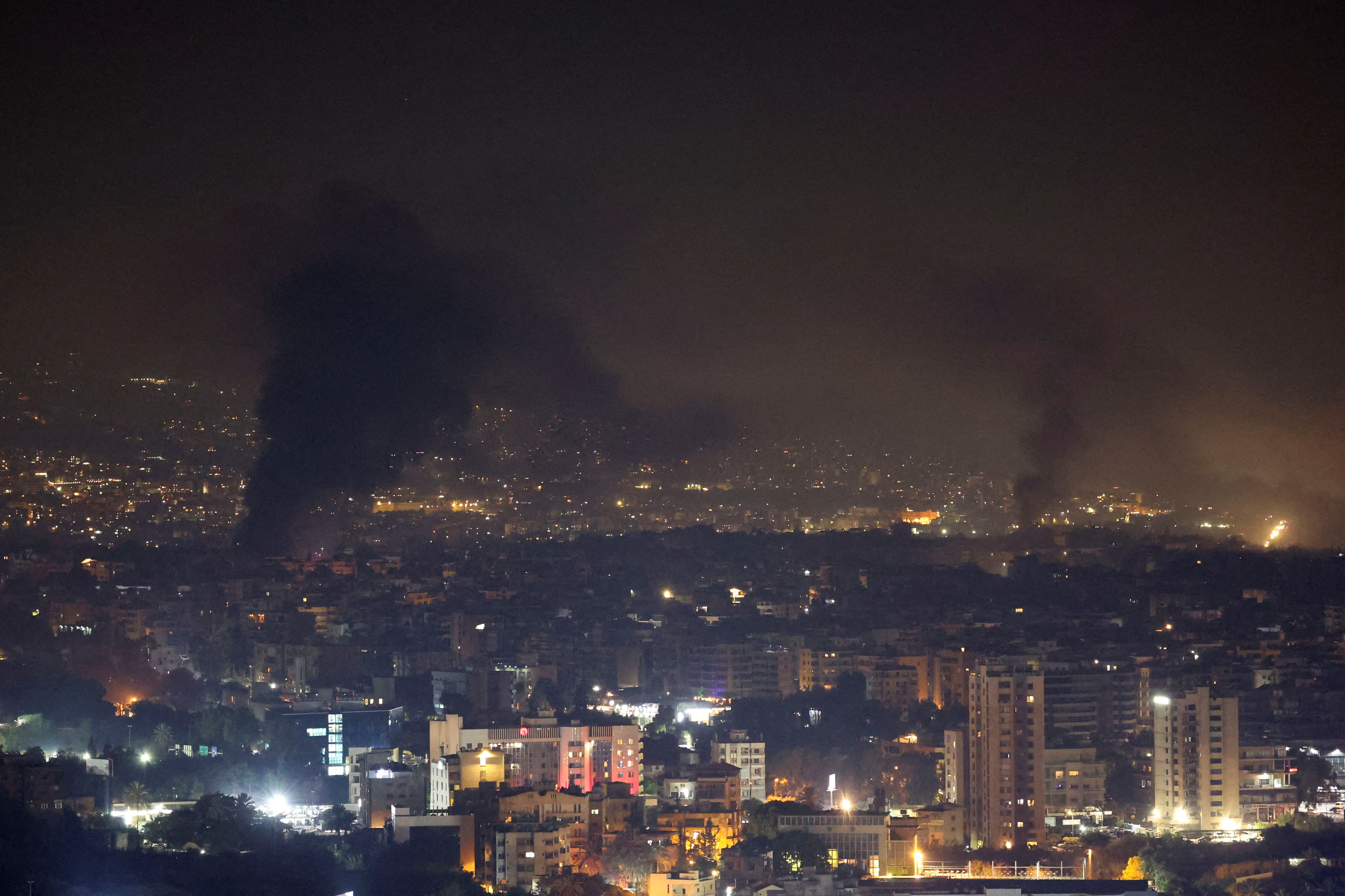 烟雾在以色列对贝鲁特南部郊区的袭击后弥漫,正值真主党与以色列军队之间的持续敌对行动,从黎巴嫩的辛埃尔菲尔看到,2024年9月28日。路透社/穆罕默德·阿扎基尔真主党的阿尔曼尔电视台报道说,七座建筑被摧毁。黎巴嫩的安全消息来源表示,目标是一个通常有高级真主党官员驻扎的地区。