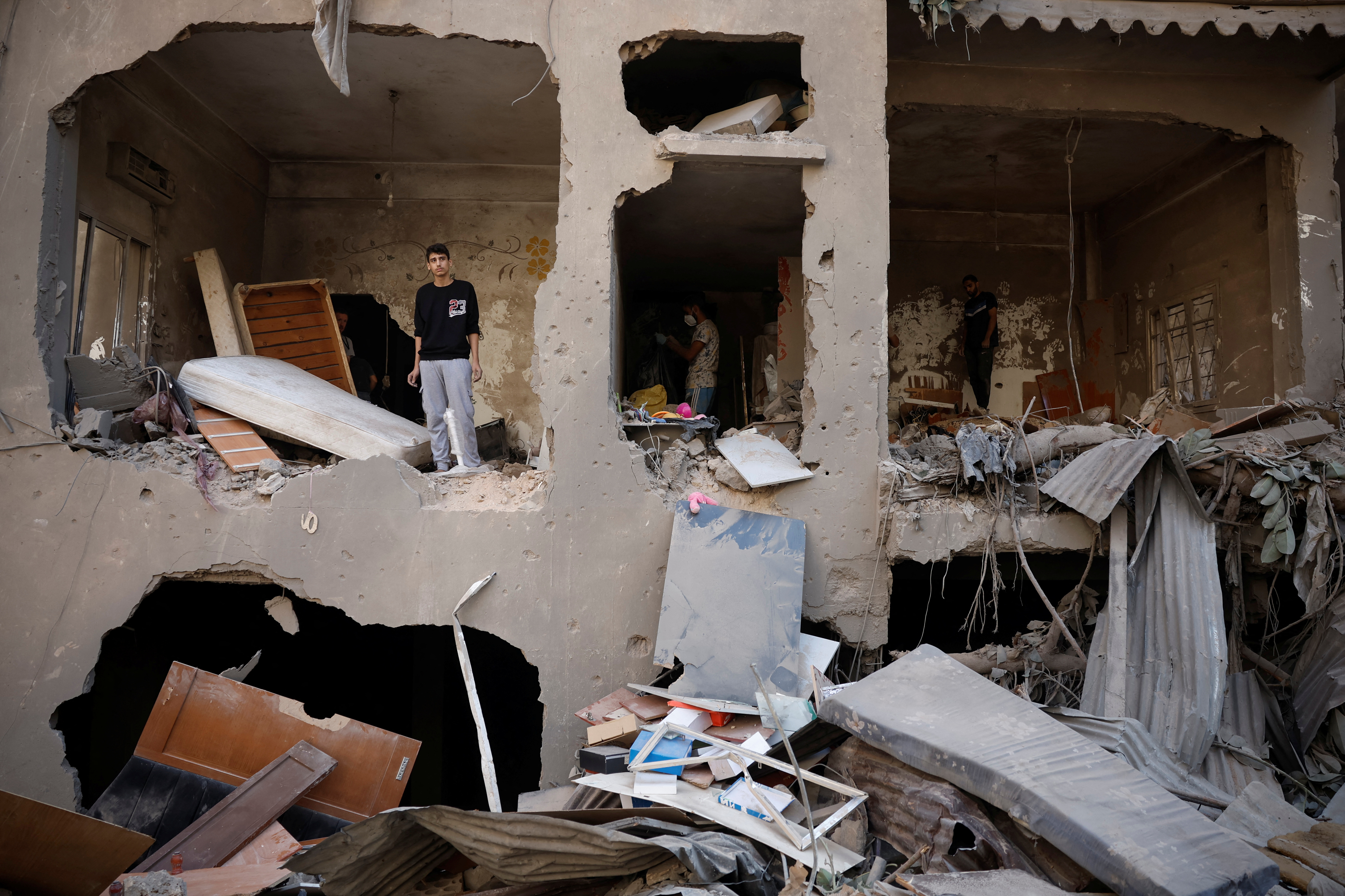 袭击撕裂了至少五栋建筑的外立面,并打碎了街上其他建筑的窗户。在一栋建筑中,客厅的残骸暴露在外,墙上仍挂着家庭肖像,灰尘覆盖的窗帘无力地垂在一旁。