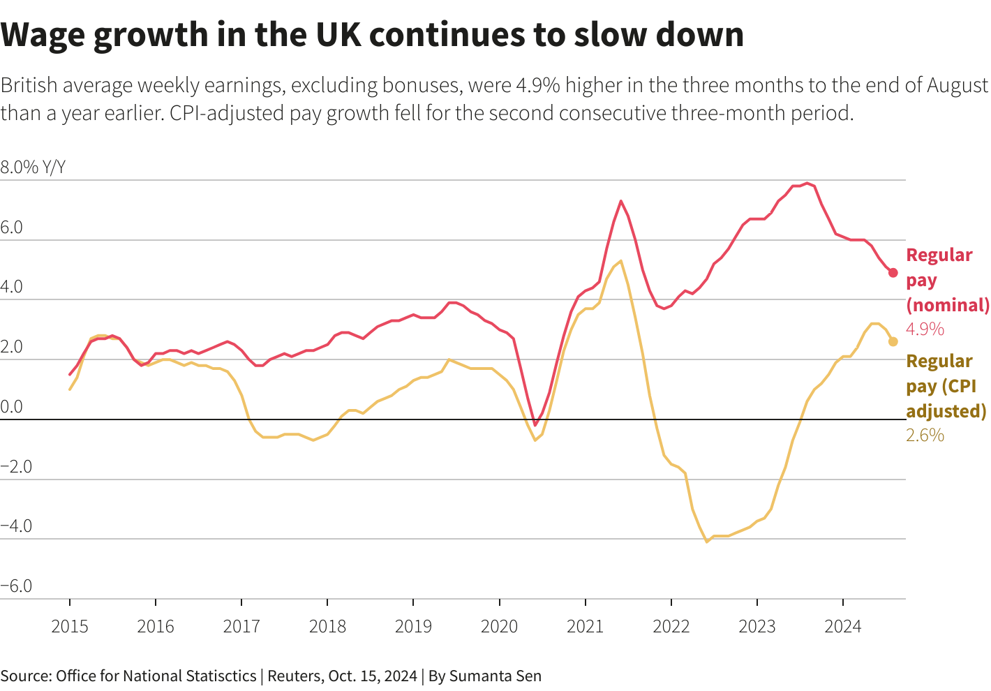 10月15日(路透社)- 根据官方数据,英国工资在截至8月的三个月内以超过两年来最慢的速度增长,职位空缺再次下降,这可能会受到英格兰银行的欢迎,因为它正在考虑何时再次降息。