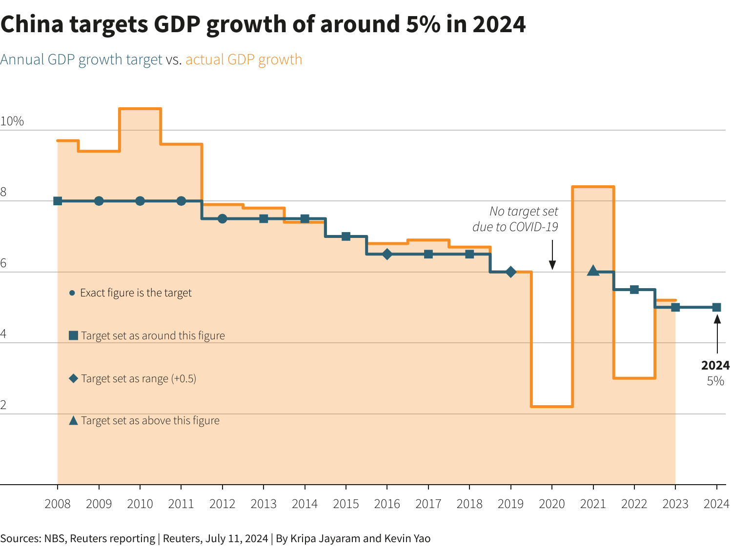 中国很少未能实现其增长目标,上一次未能实现是在2022年,当时疫情使增长降至3%,远低于约5.5%的目标。