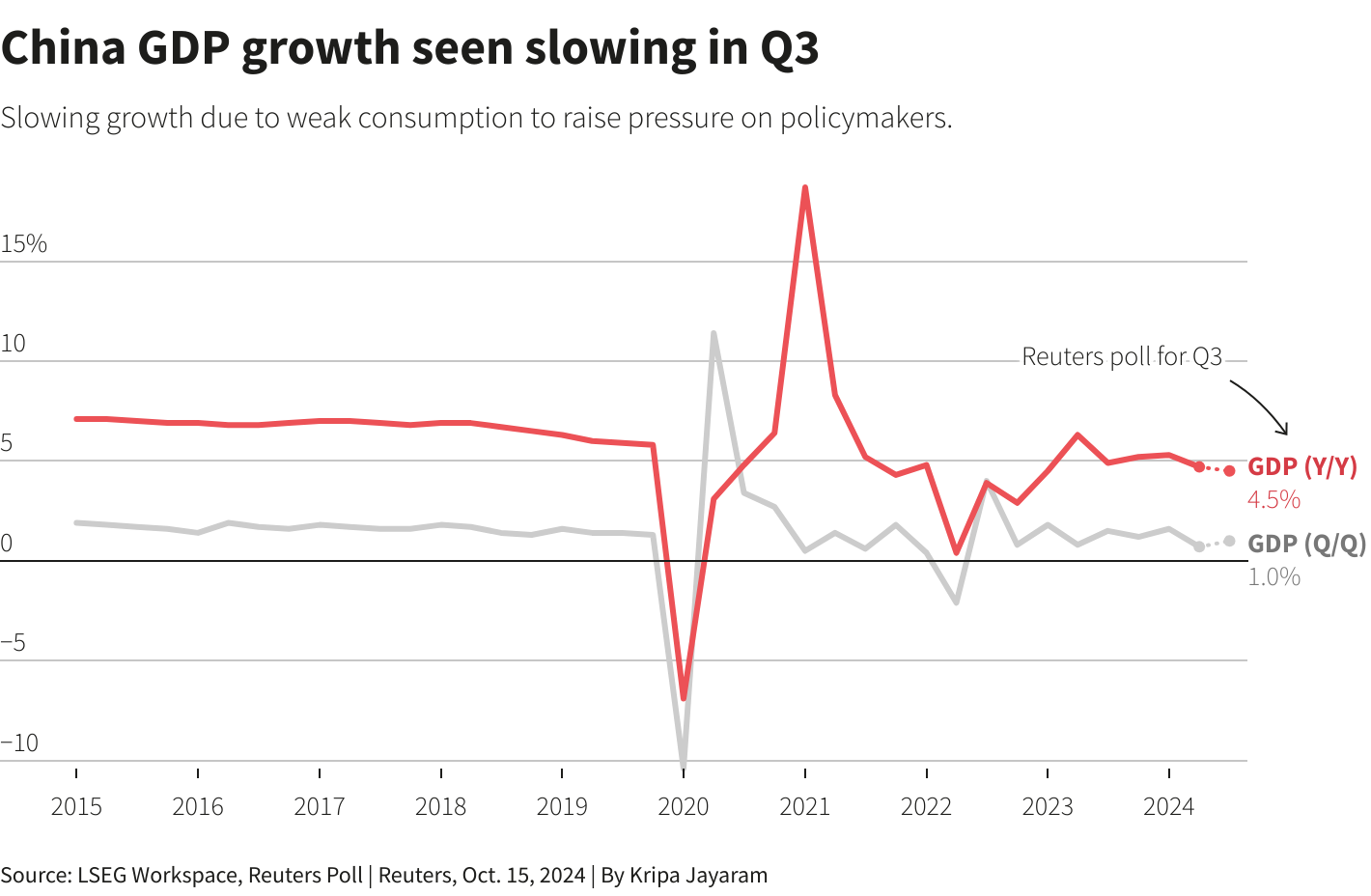 根据在9月27日至10月15日之间进行的调查,预计国内生产总值在第三季度同比增长4.5%,低于第二季度的4.7%,并达到自2023年第一季度以来的最低水平。