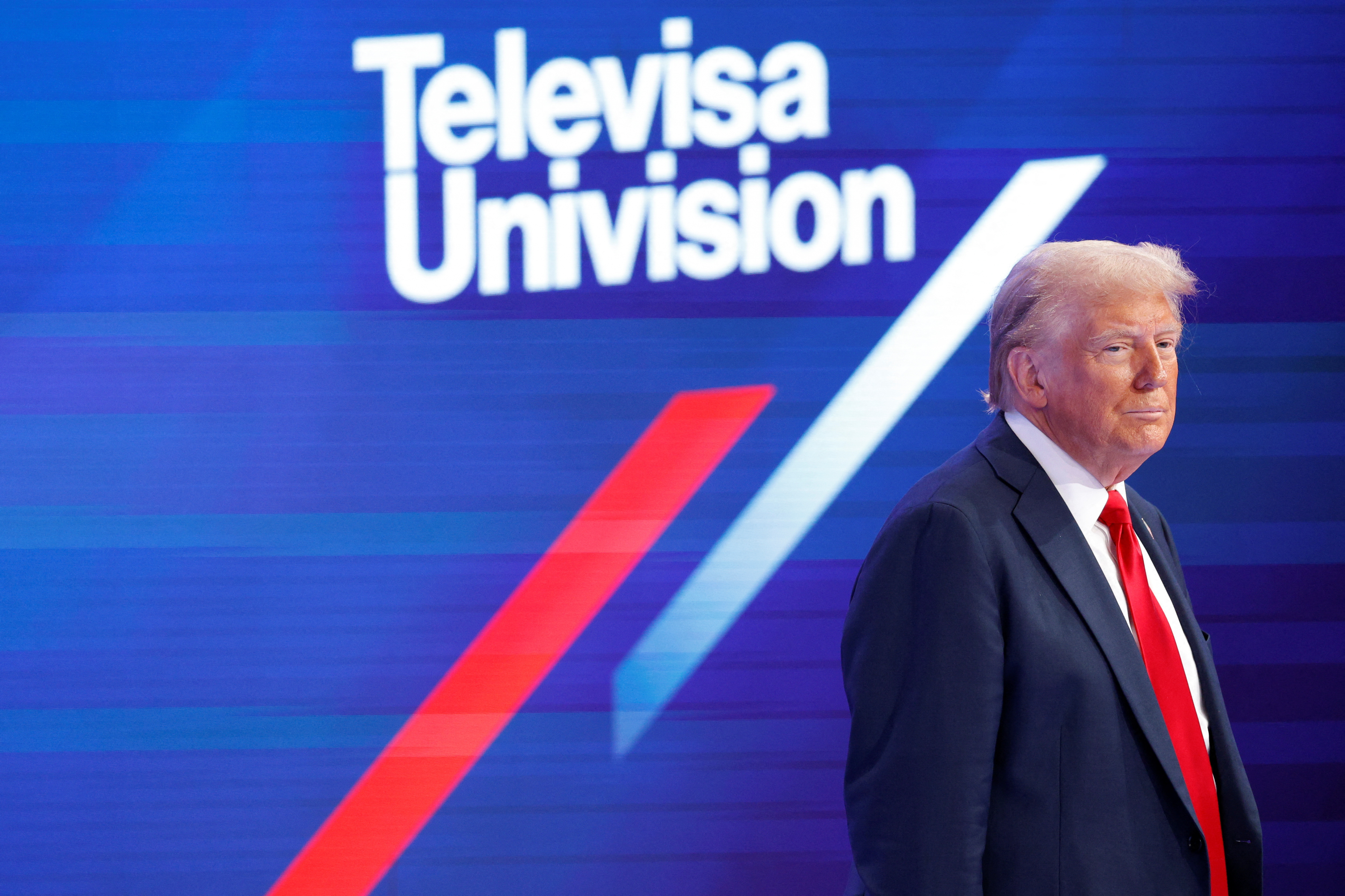 共和党总统候选人、前美国总统唐纳德·特朗普在2024年10月16日于佛罗里达州多拉尔参加西班牙语网络Univision举办的市政厅活动时发言。路透社/马尔科·贝洛