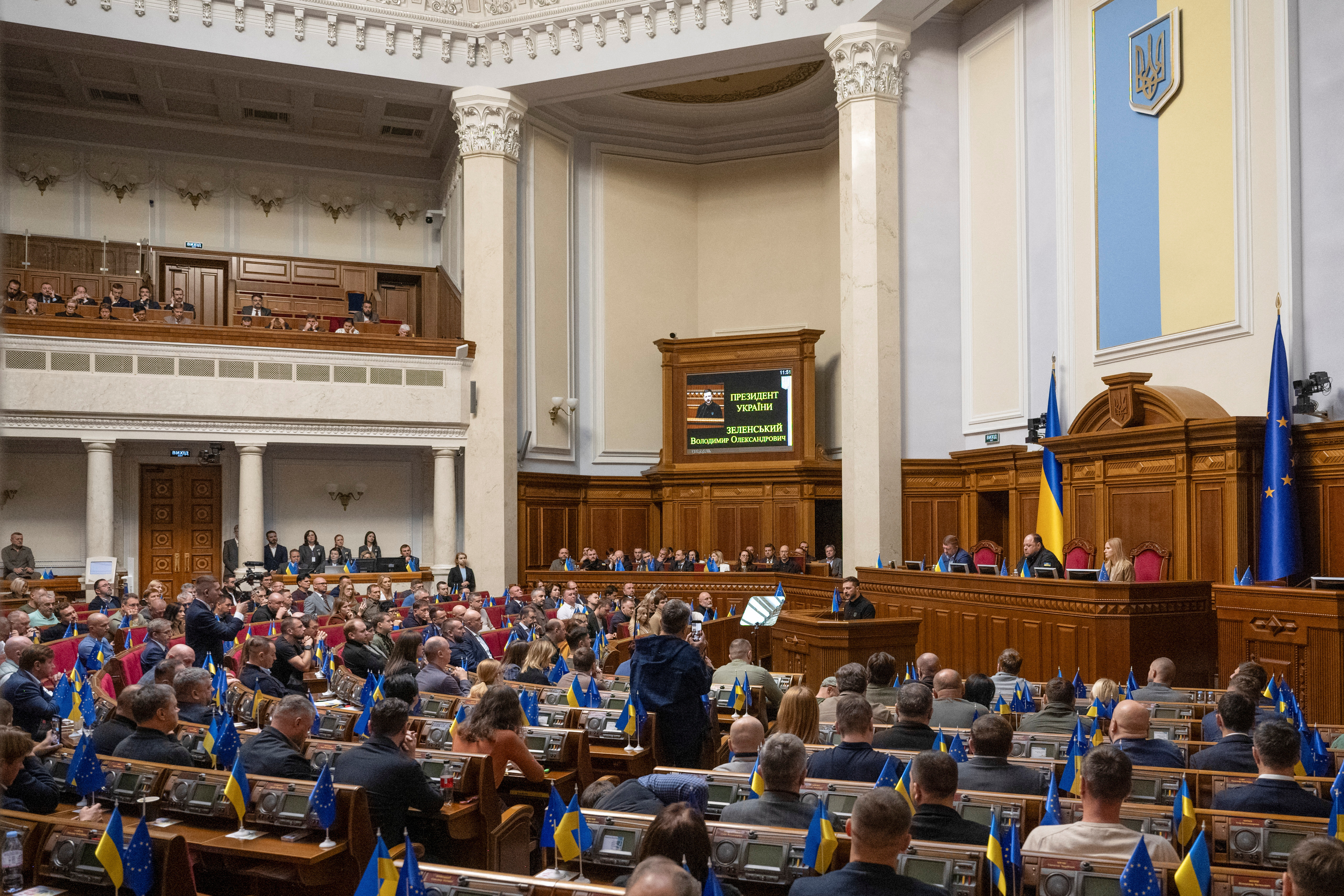 乌克兰总统弗拉基米尔·泽连斯基在乌克兰基辅的议会会议上发表讲话,介绍所谓的“胜利计划”,此时俄罗斯正在攻击乌克兰,2024年10月16日。路透社/安德烈·涅斯特连科