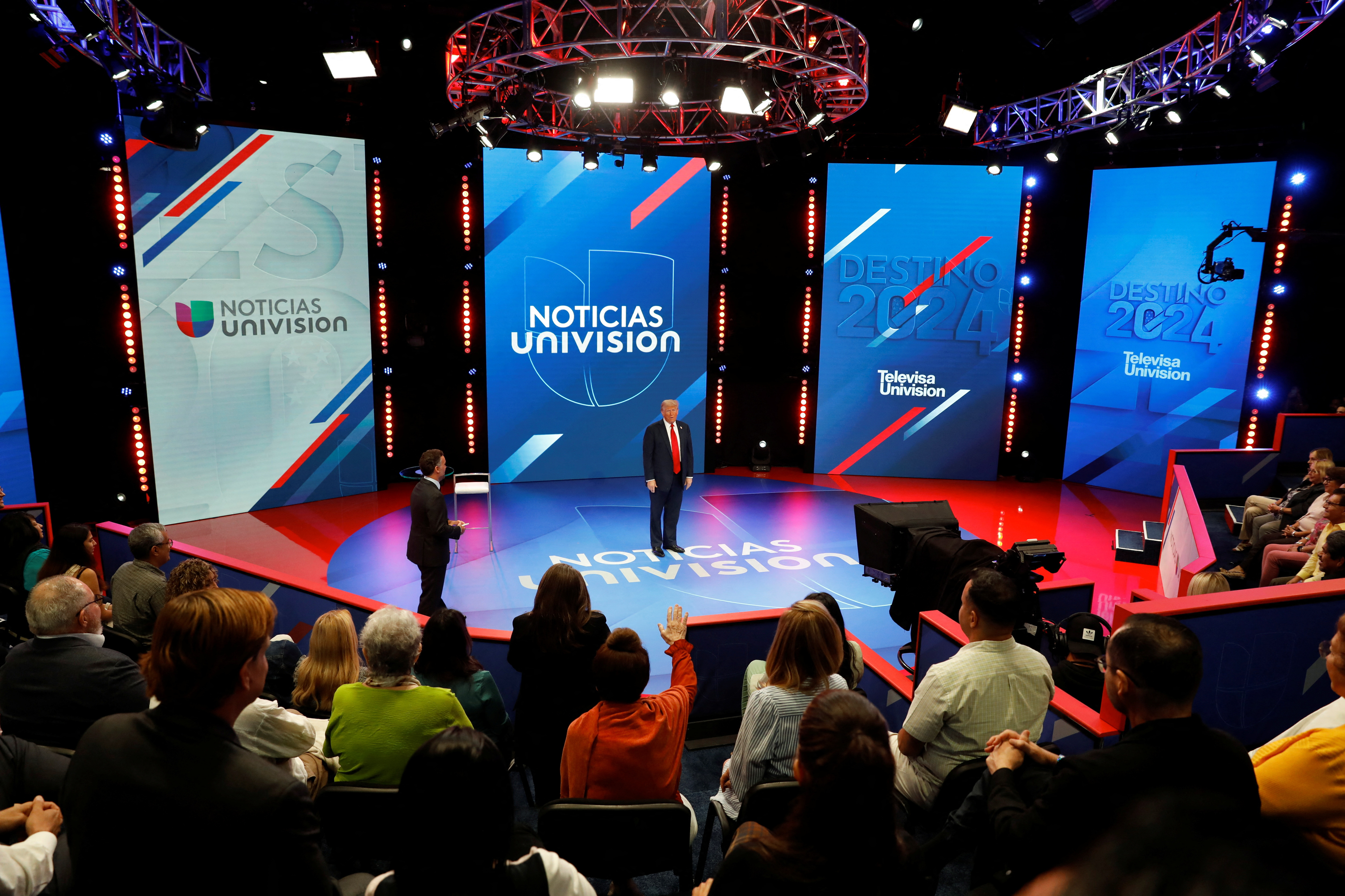 共和党总统候选人、前美国总统唐纳德·特朗普在佛罗里达州多拉尔举行的西班牙语网络Univision主办的市政厅会议上发言,时间为2024年10月16日。路透社/马尔科·贝洛