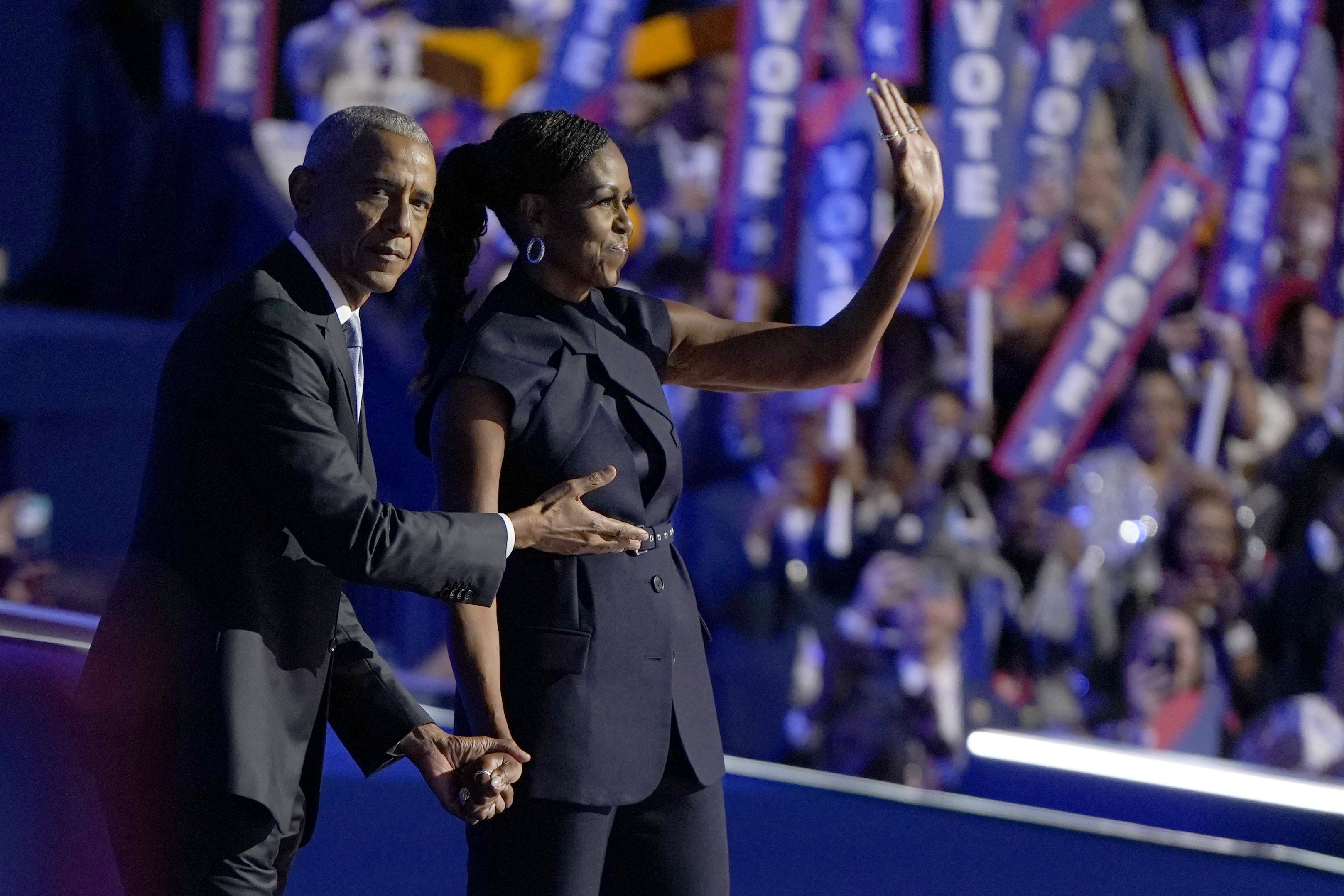 第1项,共3项 前美国第一夫人米歇尔·奥巴马和她的丈夫、前美国总统巴拉克·奥巴马在2024年8月20日美国伊利诺伊州芝加哥的民主党全国大会(DNC)第二天的舞台上站着。路透社/伊丽莎白·弗朗茨/档案照片