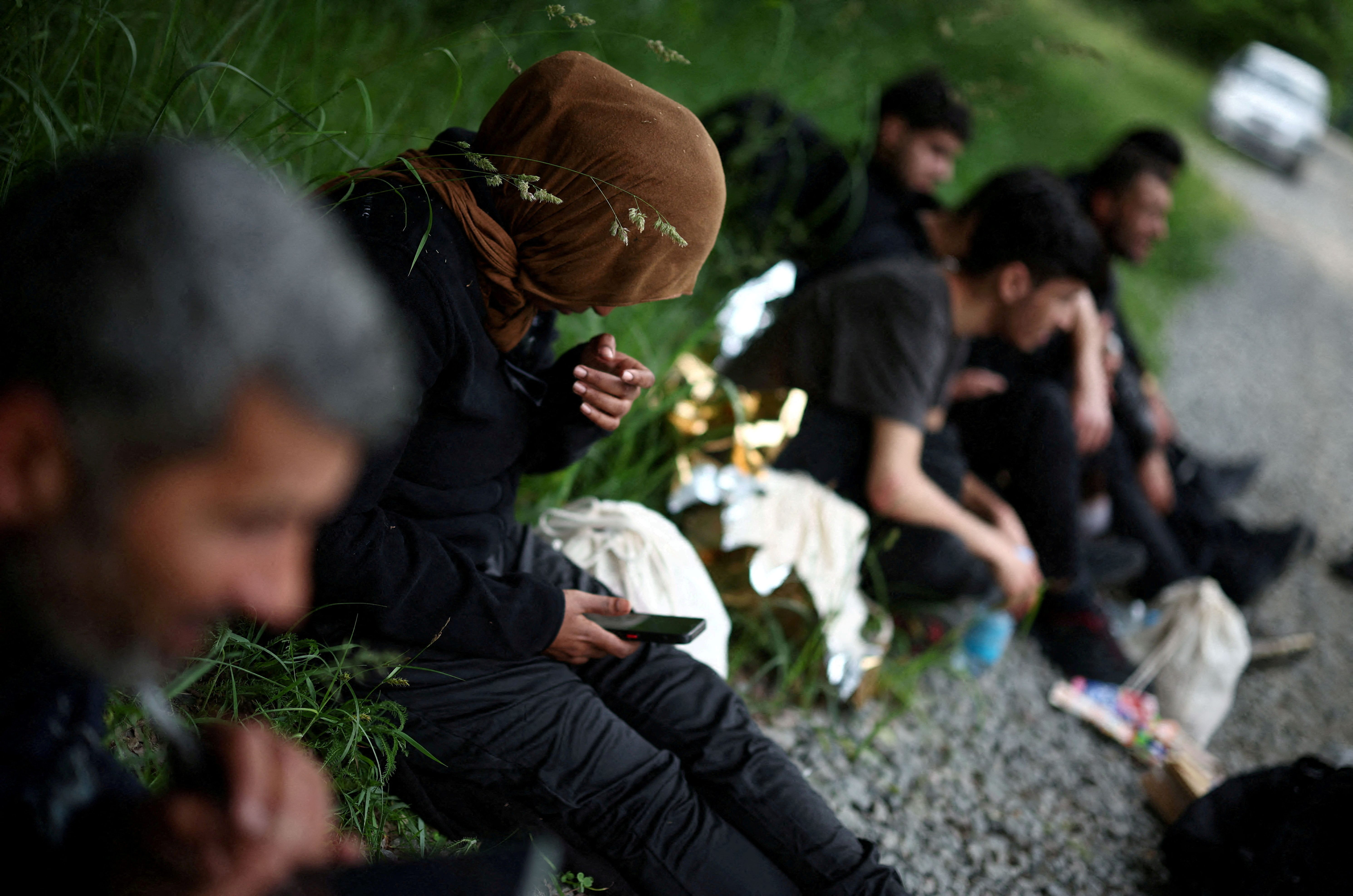 第1项,共5项 移民在森林中坐着,穿越白俄罗斯-波兰边界,靠近波兰格鲁德基,2024年6月4日。路透社/Kacper Pempel/档案照片