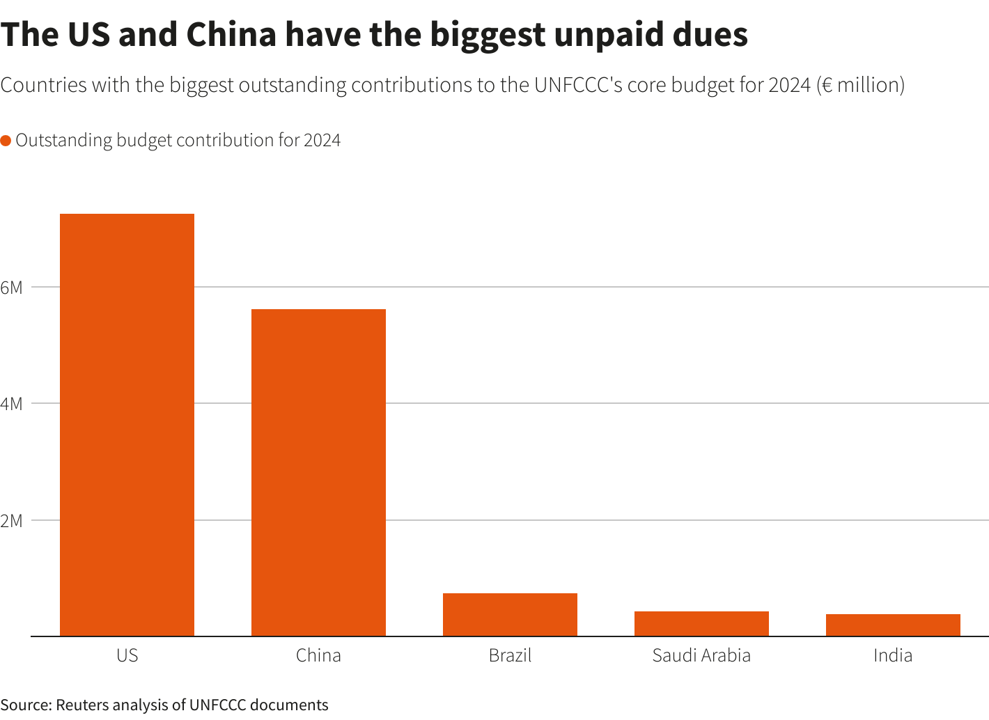 截至十月,美国仍然 欠联合国气候变化框架公约2024年核心预算730万欧元,尽管它已向其补充预算贡献了250万欧元。中国仍欠核心预算560万欧元,尽管它已向补充基金贡献了49.7万欧元。