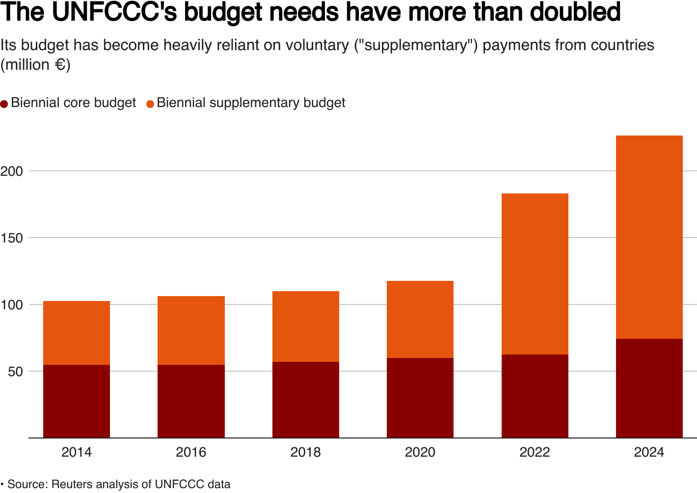 UNFCCC设定的预算跨越两年。其2024-2025年的总预算 - 该机构的三个主要预算项目合并 - 为2.4亿欧元,其中大约一半预计将分配给今年。