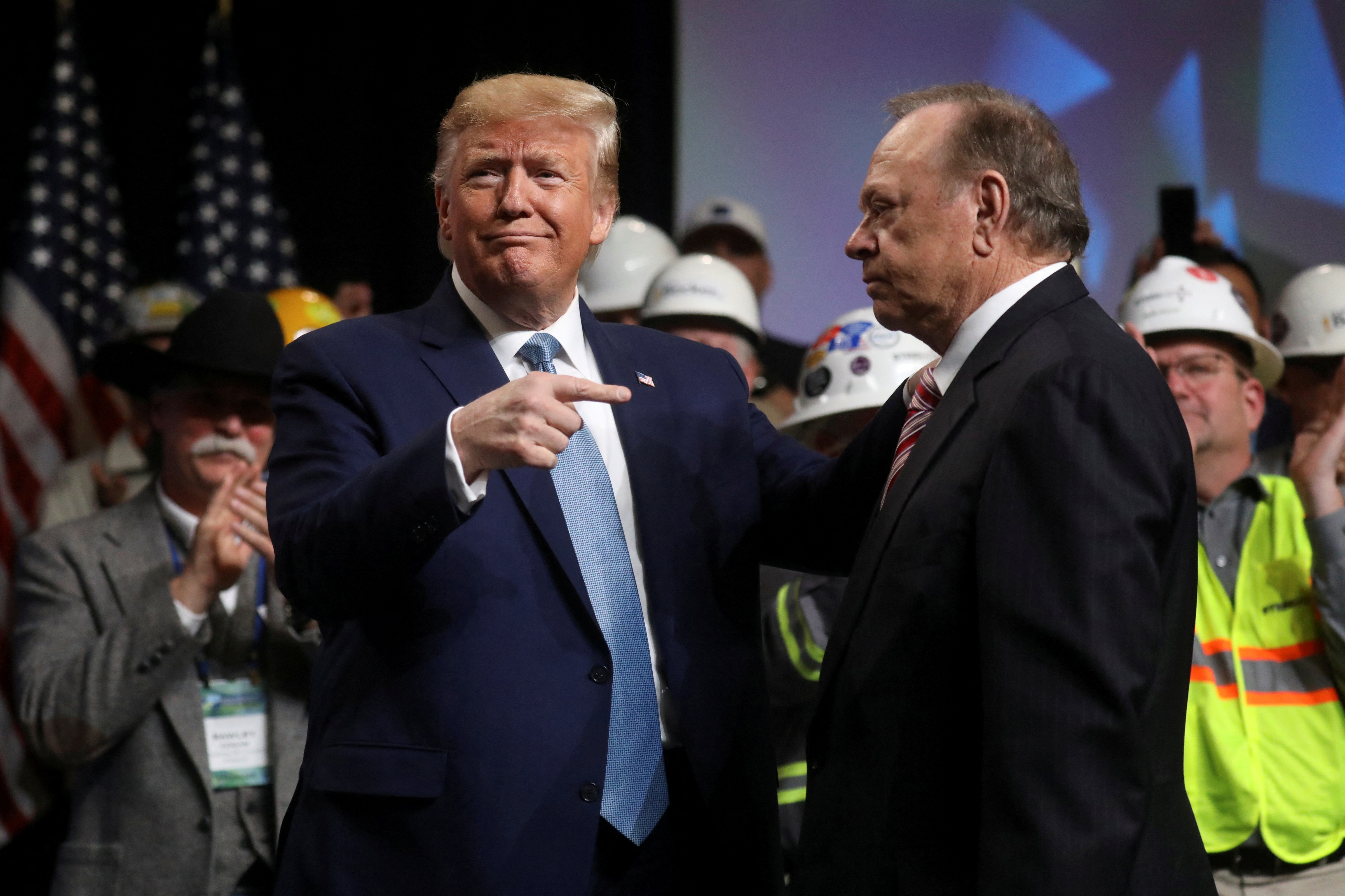 项目 1 共 4 项 美国总统唐纳德·特朗普在2019年10月23日于宾夕法尼亚州匹兹堡举行的页岩洞察2019会议上,向哈罗德·哈姆致意,哈姆为他介绍。路透社/利亚·米利斯/档案照片