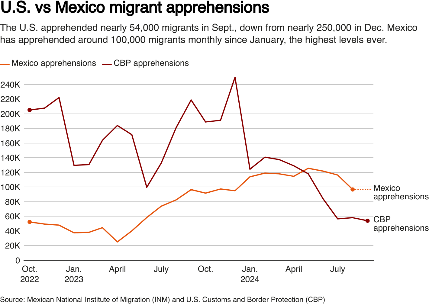 这场持续了十个月的打击行动是应美国的压力而进行的,墨西哥官员告诉路透社,包括在12月临时关闭几条进入墨西哥的贸易路线,估计每日成本为1亿美元,以及美国官员在私人会议和拜登总统与墨西哥总统之间的电话中提出的明确请求。哈里斯在她的竞选中利用美国的数据来论证拜登政府在边境问题上采取了强硬立场。