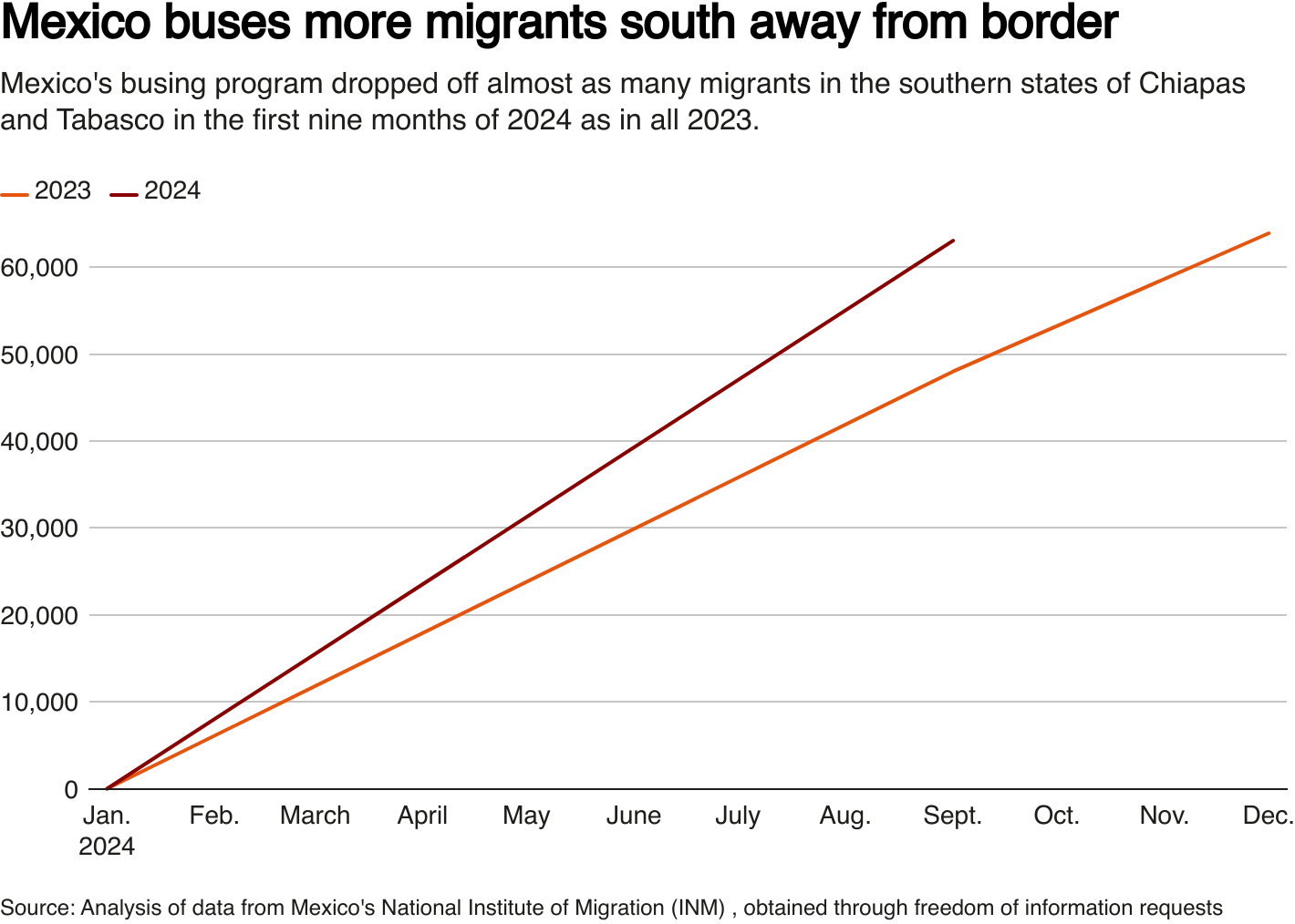 根据公共数据和与十几位美国和墨西哥官员的对话,这次打击行动包括一个日益增长的计划,将非墨西哥移民通过巴士和飞机转移到该国南部,远离美国边境,同时伴随着广泛的拘留和行政障碍。