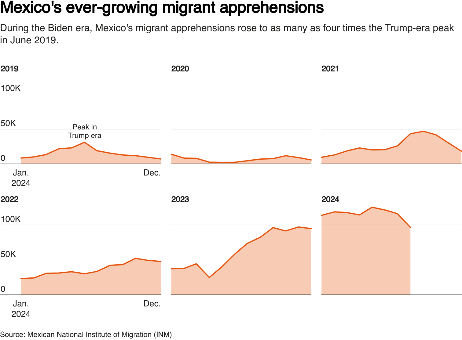 乔治梅森大学的移民专家贾斯廷·盖斯特表示:“一个被认为失控的边界是唐纳德·特朗普的燃料。”他表示,墨西哥的打击行动帮助拜登政府“扑灭了那场火”。