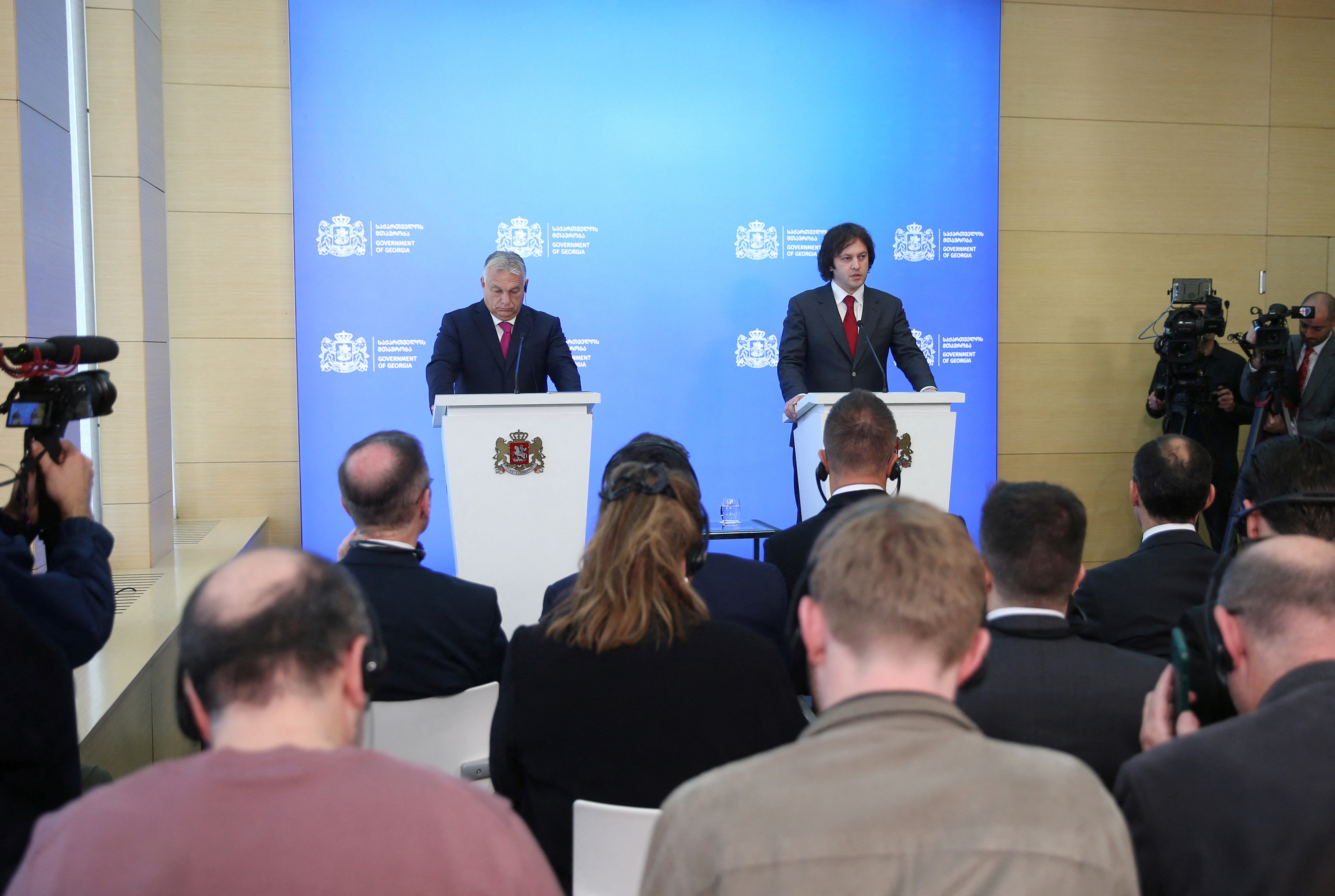 项目 1 共 4 项 匈牙利总理维克托·欧尔班和格鲁吉亚总理伊拉克利·科巴基泽在格鲁吉亚第比利斯举行联合新闻发布会,2024年10月29日。路透社/伊拉克利·格德尼泽