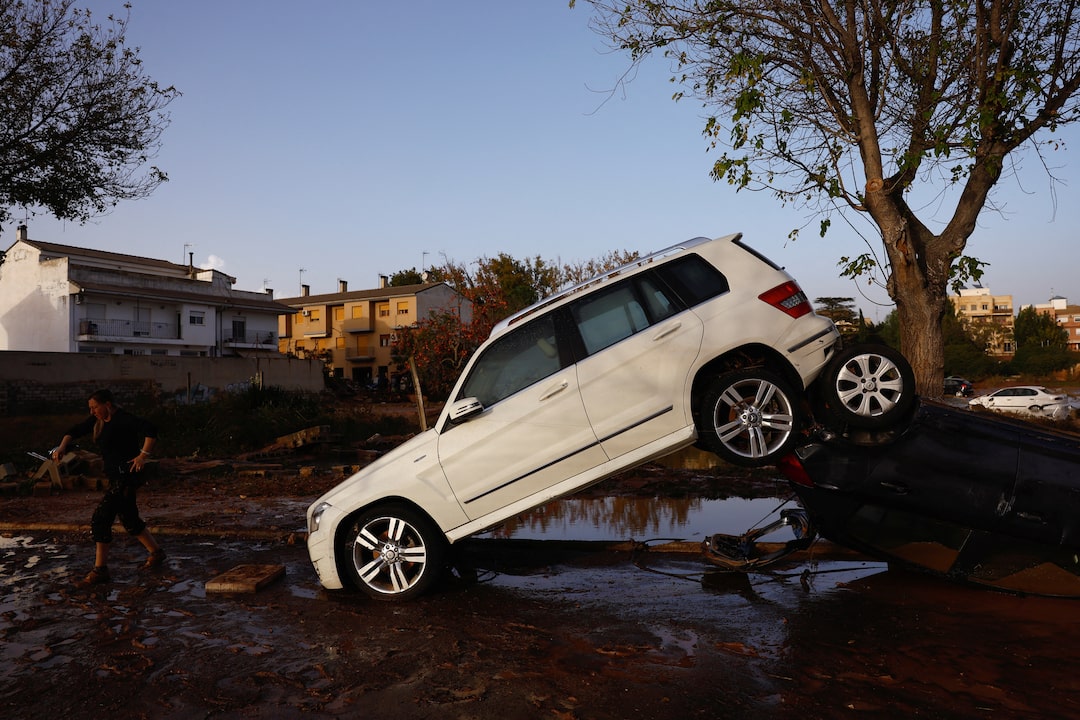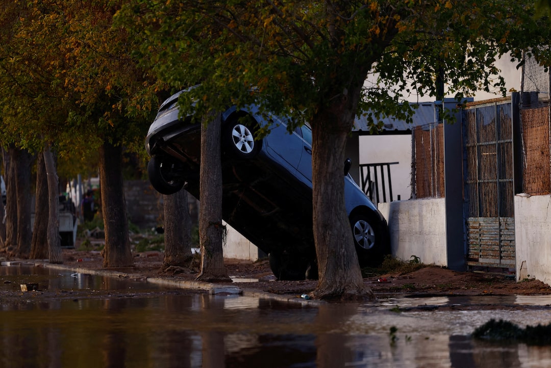 一辆汽车在西班牙乌蒂尔的严重洪水后,危险地靠在墙上,日期为10月30日。路透社/苏萨娜·维拉瓦伦西亚地区的一些地方,如图里斯、奇瓦或布诺尔镇,降雨量超过400毫米(15-3/4英寸),导致国家气象局AEMET在周二发布红色警报。由于降雨减弱,周三降级为琥珀色警报。