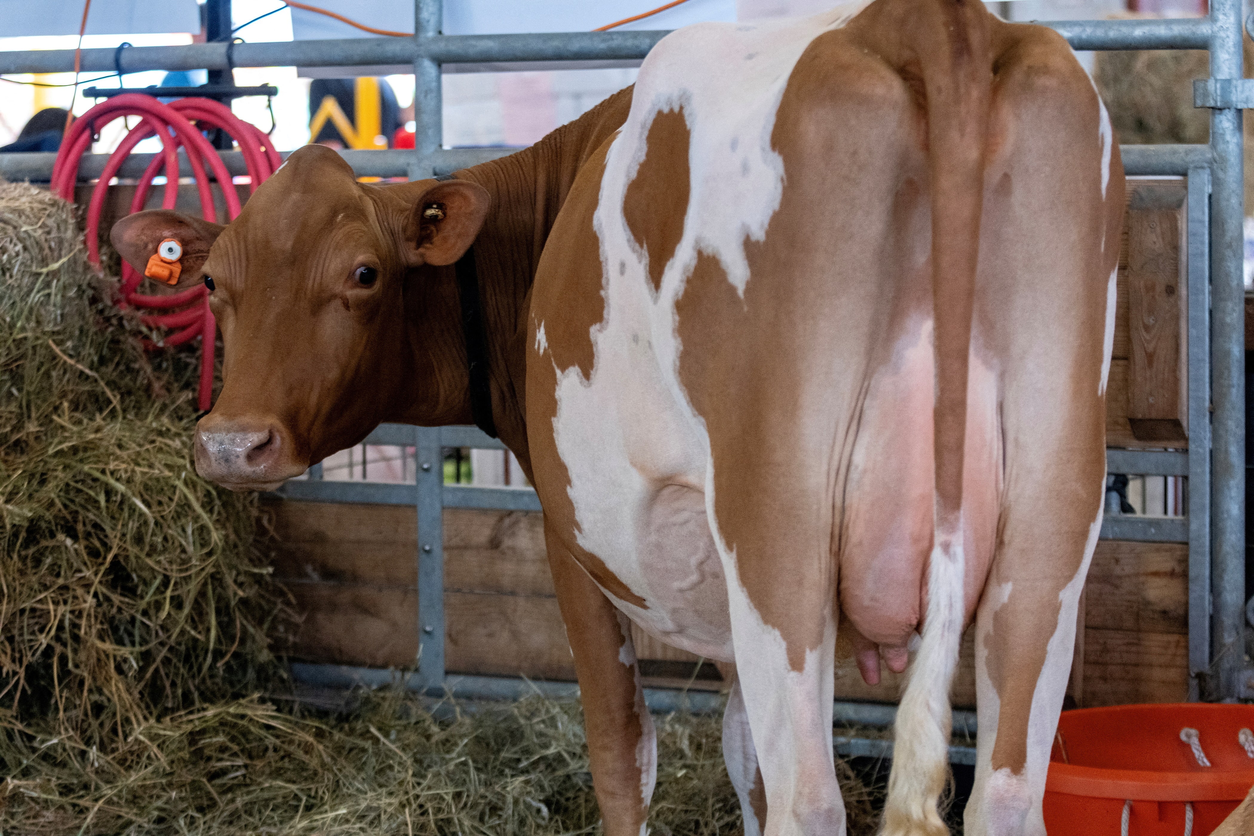 项目 1 共 3 一头牛在美国威斯康星州西阿利斯的州博览会上由一名展览者展示,2024年8月9日。乳制品农民在展出牛只期间采取预防措施,进行禽流感检测。路透社/吉姆·冯德鲁斯卡/档案照片