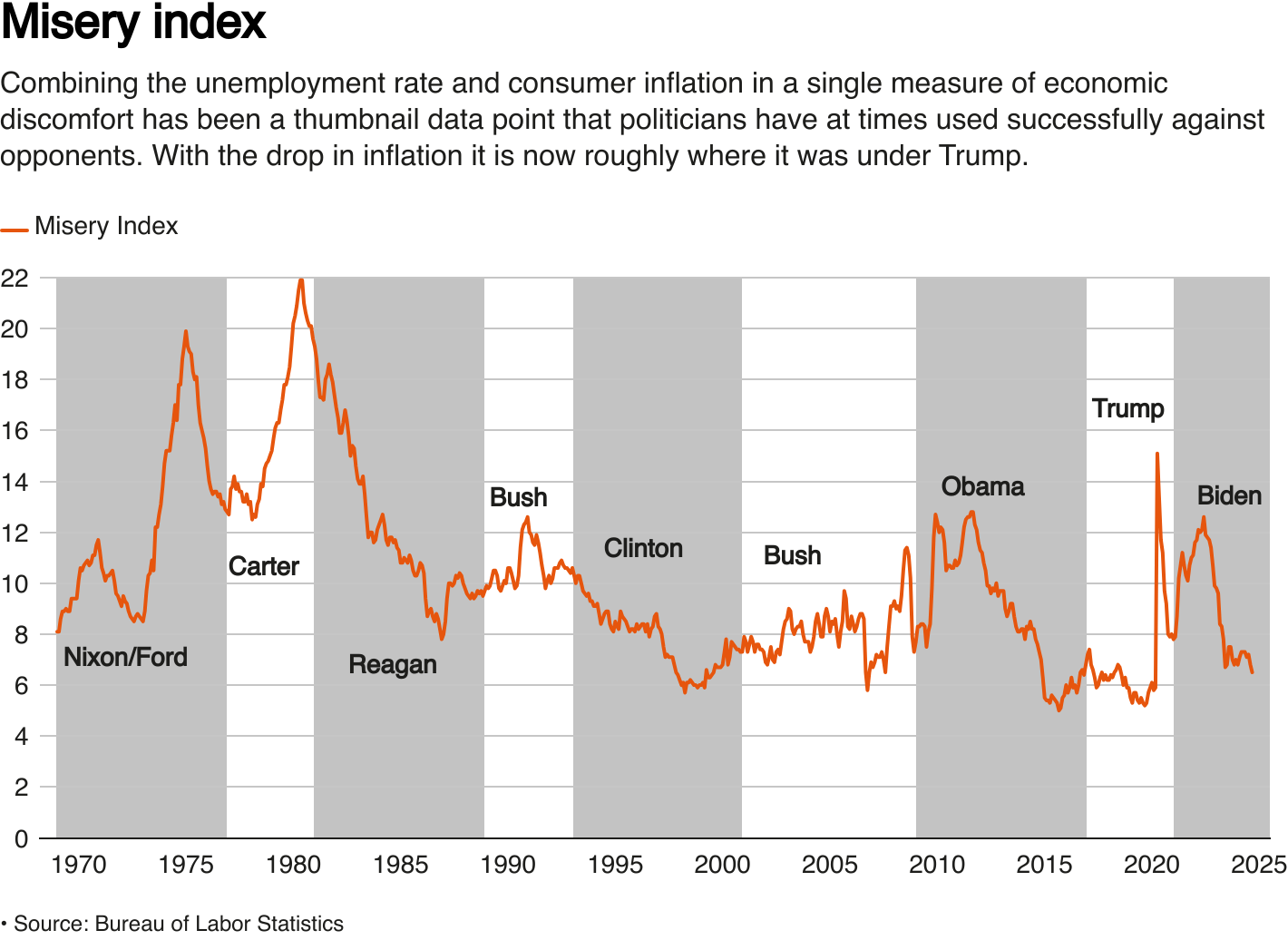 将失业率和通货膨胀率结合起来,形成经济困境的简要描述,政治家们常常用它来攻击对手,特别是在高通胀时期。随着通胀的下降,它回到了特朗普任期内大部分时间的水平。
