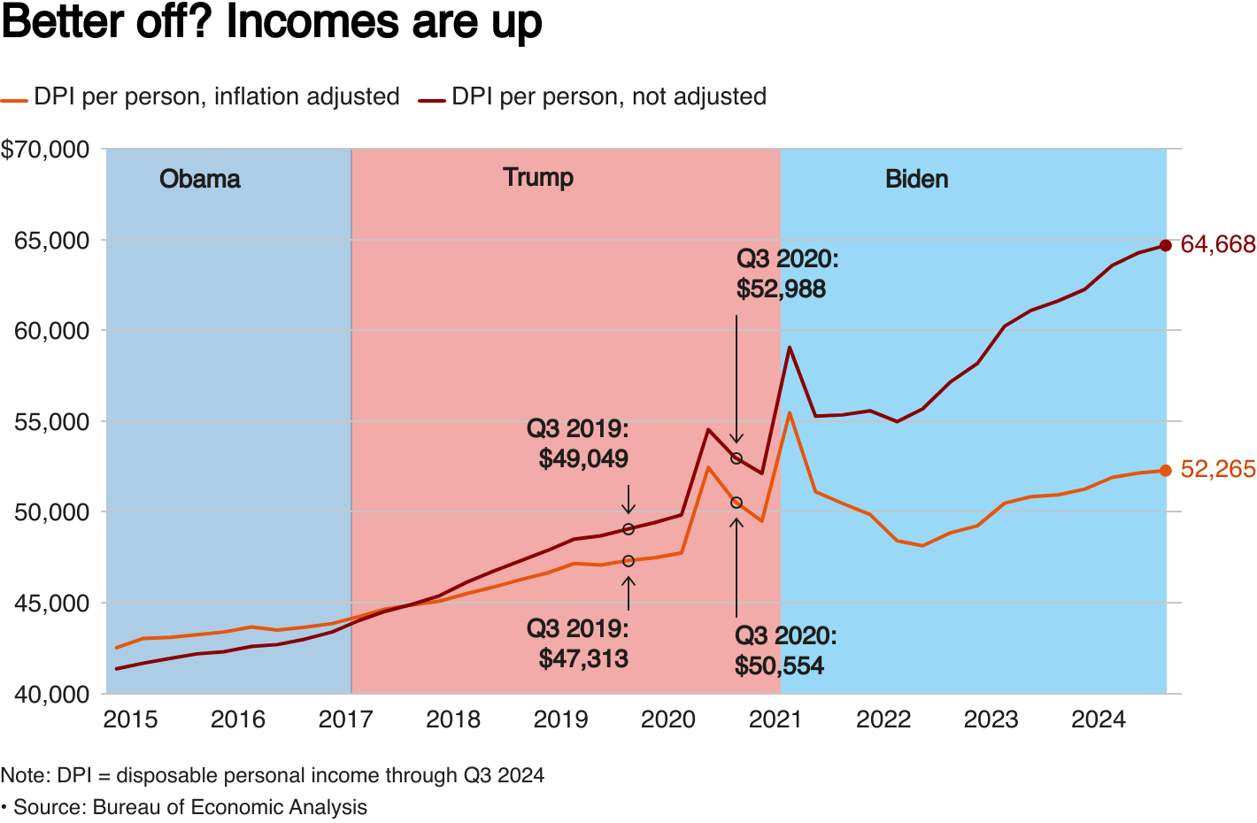 尽管在这过程中由于联邦支出一度提升了收入,随后价格上涨又削弱了购买力,但截至今年第三季度,按通货膨胀调整后的人均收入比2019年第三季度高出约10%。
