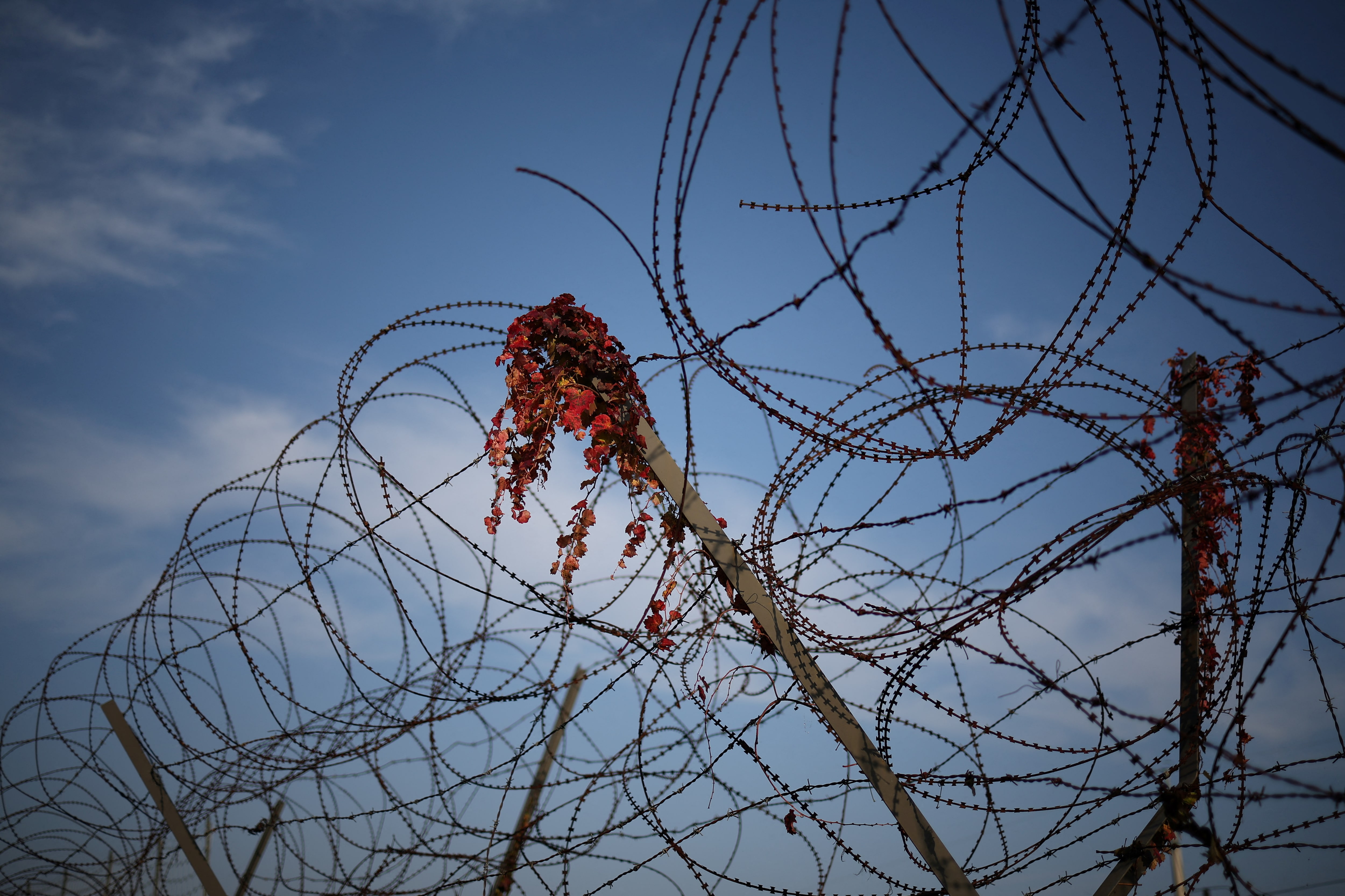 第1项,共3项 秋天的树叶缠绕在韩国坡州的军事围栏上,靠近分隔两韩的非军事区,2024年10月31日。路透社/金洪志
