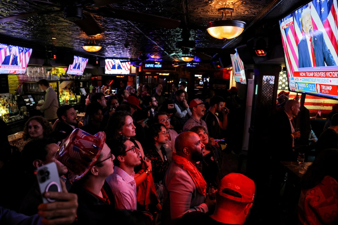3名支持者中的第1名 共和党总统候选人前美国总统唐纳德·特朗普的支持者在观看显示特朗普在棕榈滩县会议中心演讲的屏幕时,参加了2024年美国总统选举期间在纽约市曼哈顿举行的纽约青年共和党俱乐部观影派对,时间为2024年11月6日。路透社/安德鲁·凯利