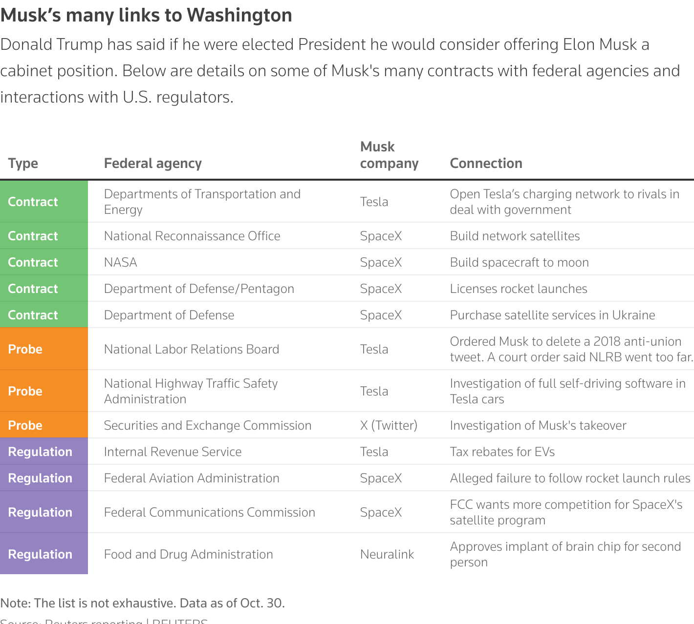 一张显示埃隆·马斯克的公司与联邦机构合同链接的表格。