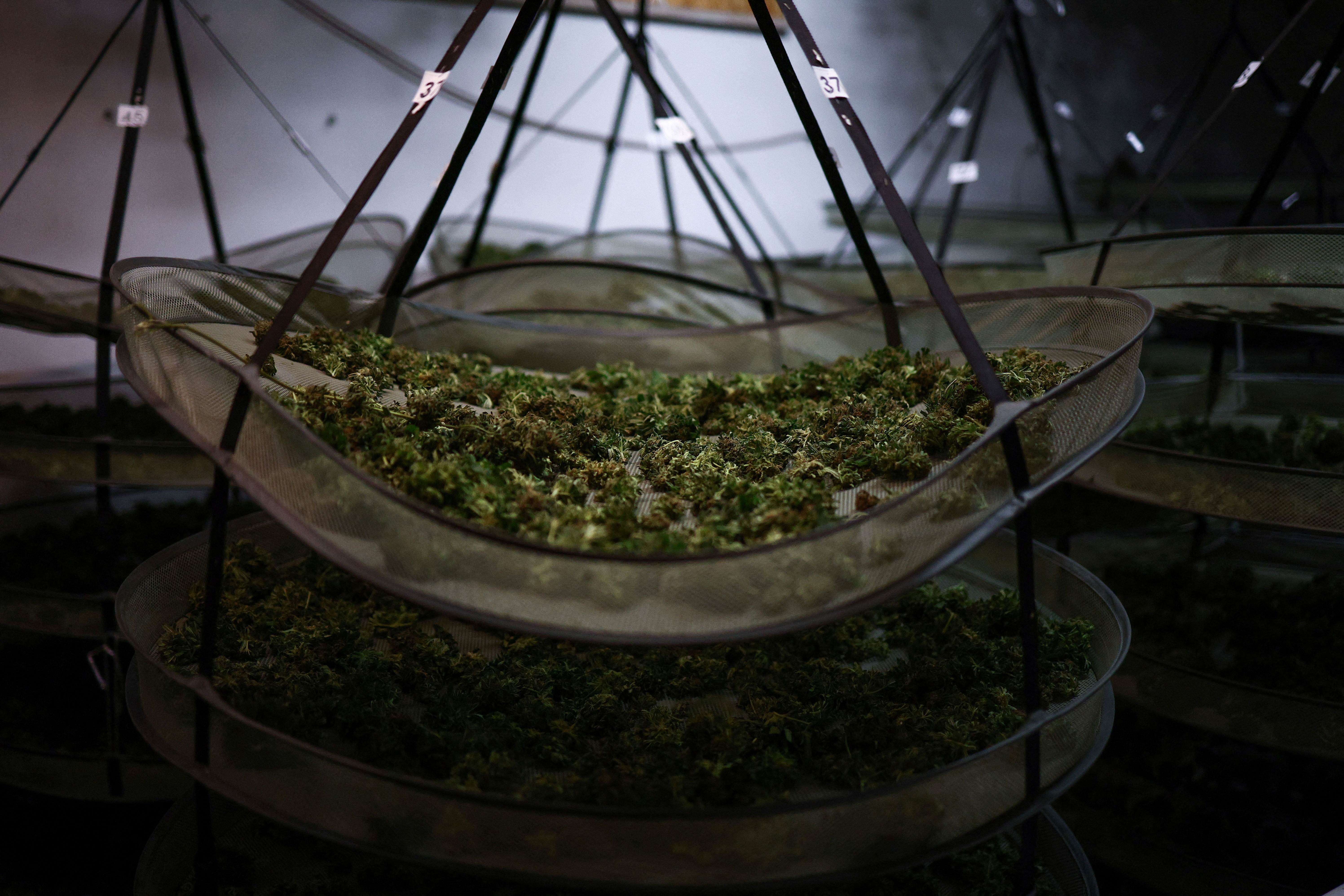第1项,共5项 大麻花源自大麻植物,这是一种含有极低水平四氢大麻酚(THC)的大麻,在意大利罗马的“Canapando”大麻农场进行干燥处理,2024年10月17日。路透社/古列尔莫·曼贾帕内