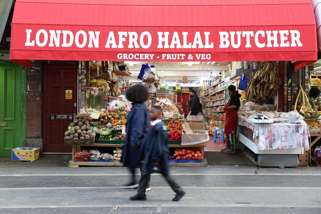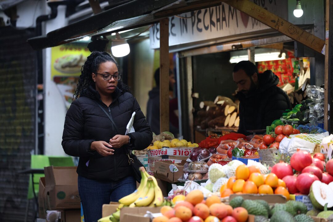第1项,共6项 一个人在佩卡姆购买新鲜产品,此时凯米·巴登诺克当选为保守党首位尼日利亚女性领导人,地点:英国伦敦,日期:2024年11月5日。路透社/米娜·金