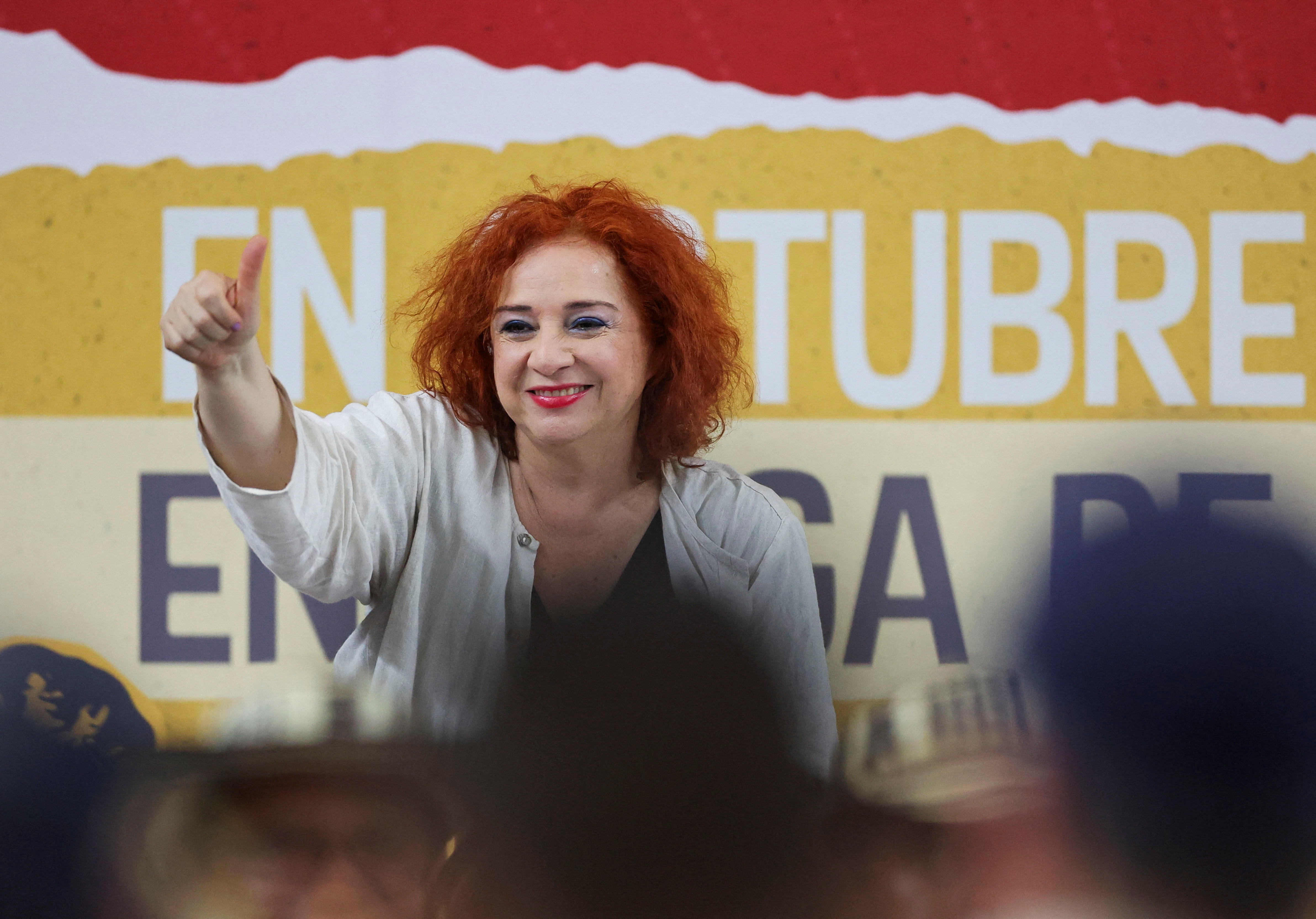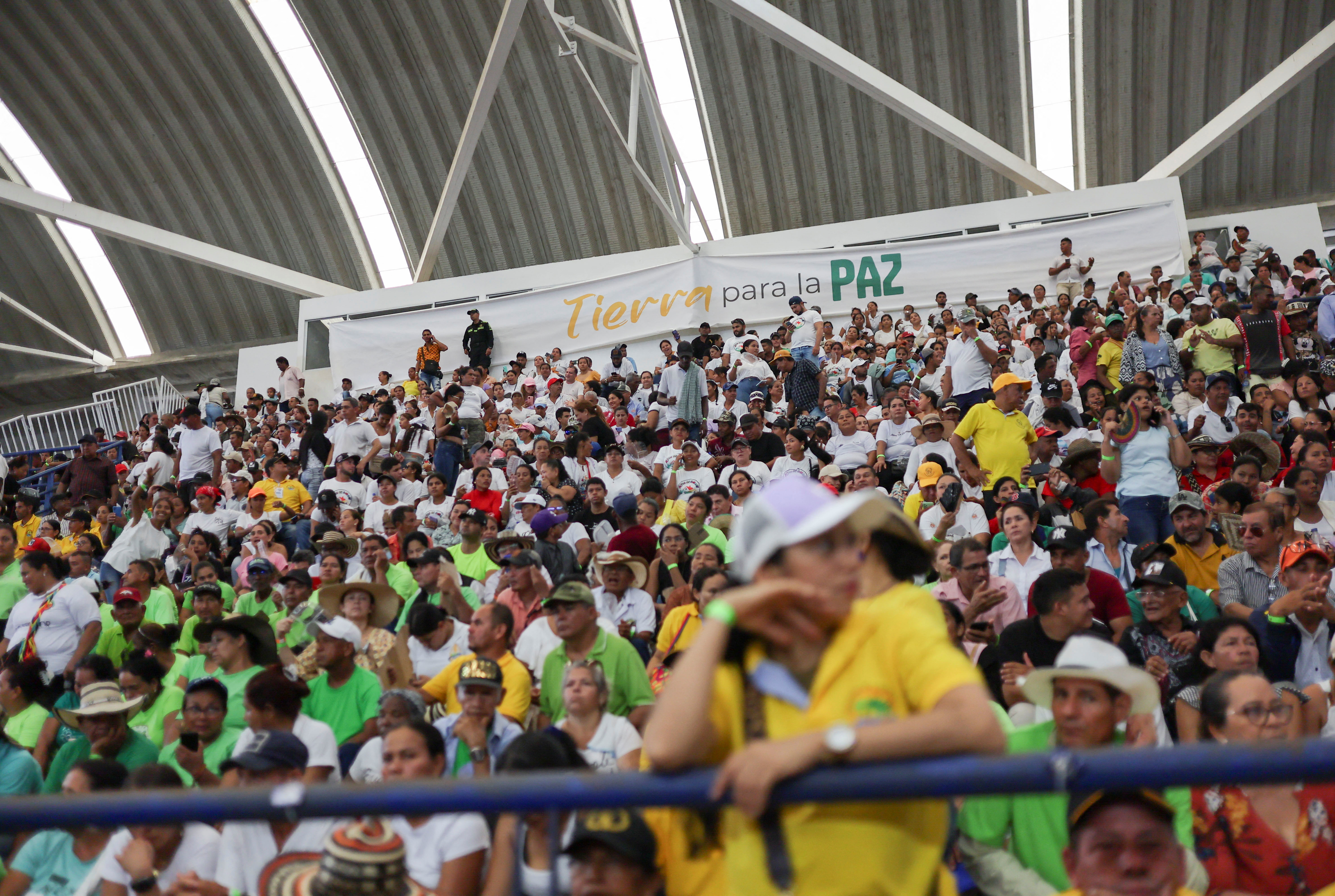 第1项,共8项 在哥伦比亚蒙特里亚举行的哥伦比亚总统交接活动中,看到一块写着“土地换和平”的标志,交接了曾被准军事组织占领的数千英亩土地,作为对该国六十年冲突受害者的赔偿,时间为2024年10月3日。路透社/路易莎·冈萨雷斯