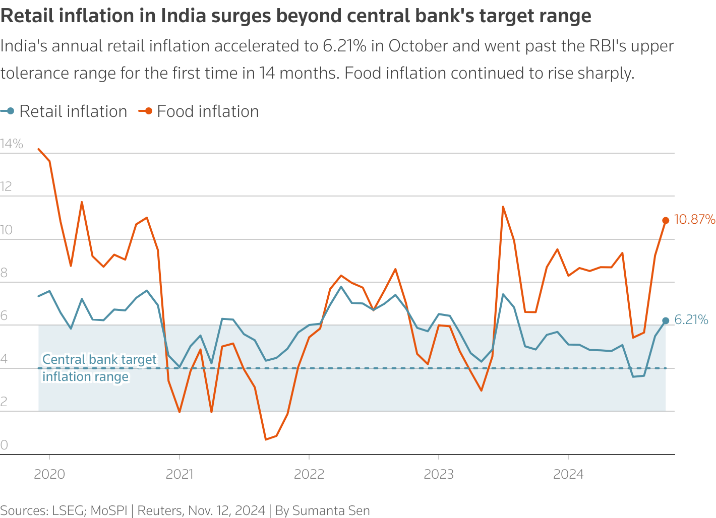 10月份的年零售通货膨胀率为6.21%,首次突破中央银行的容忍区间,且高于路透社调查的5.81%的预估。调查,周二发布的政府数据显示。印度储备银行(RBI)被要求将通货膨胀控制在2%-6%的范围内,中期目标为4%。