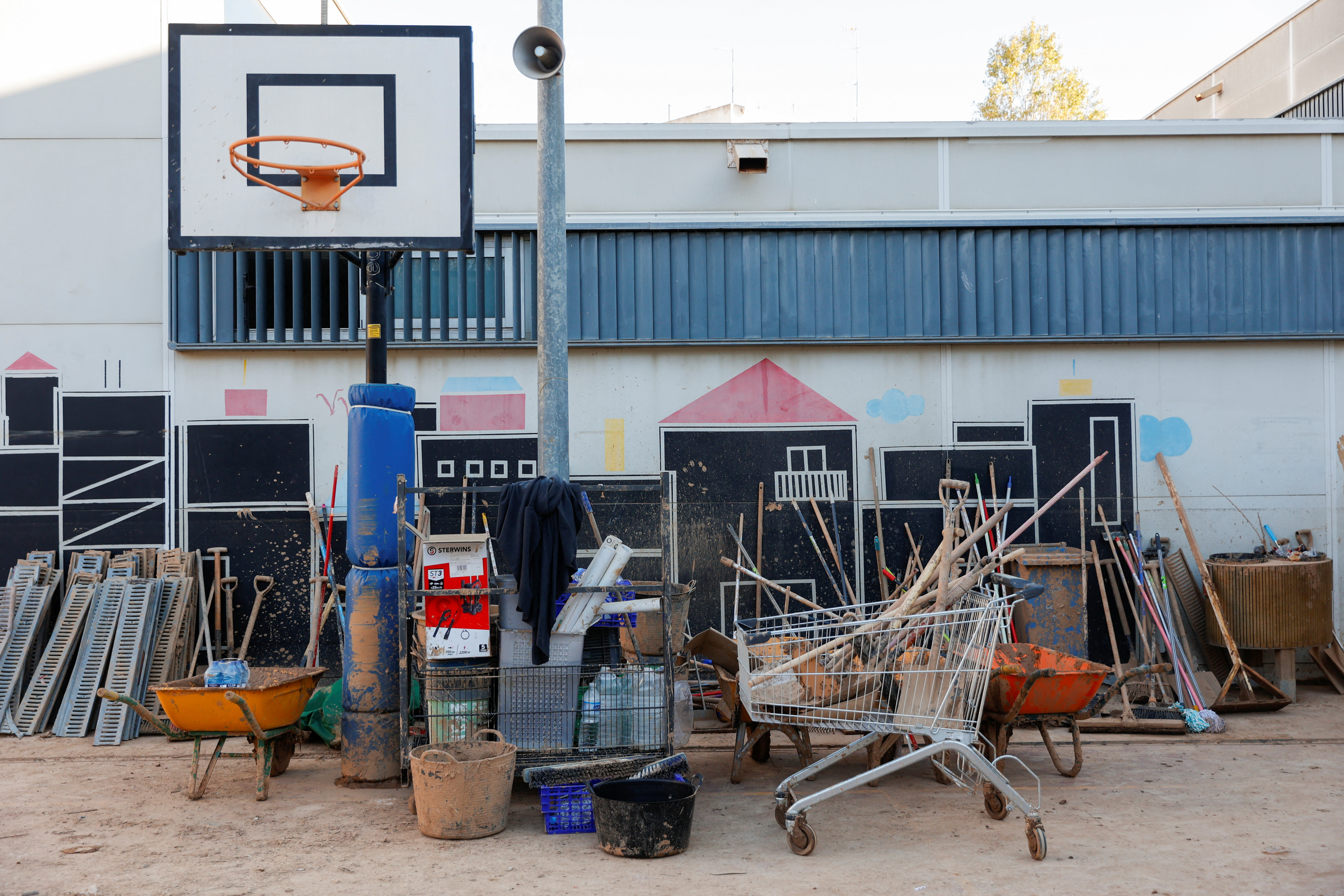第1项,共5项 清洁工具被放置在胡安XXII学校的操场上,该校预计将在几天后开放,此前的暴雨导致西班牙卡塔罗哈的洪水泛滥,2024年11月11日。路透社/Eva Manez