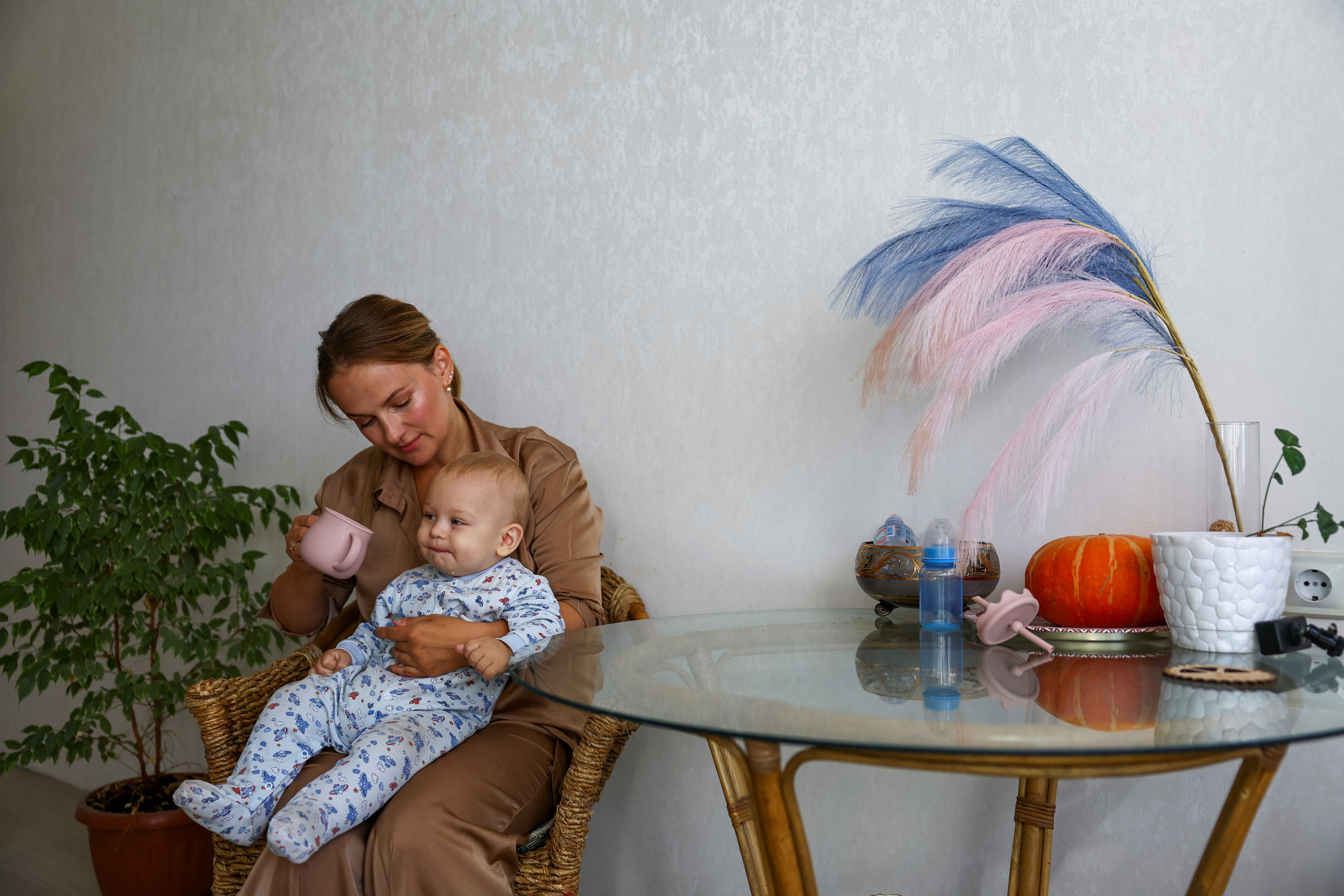 第1项,共7项 博主和营销人员阿丽娜·日哈诺娃(Alina Rzhanova),33岁,在2024年10月3日于俄罗斯雅罗斯拉夫尔市的公寓内接受路透社采访时,调整她八个月大的儿子伊戈尔(Igor)的衣服。路透社/叶夫根尼亚·诺沃任娜