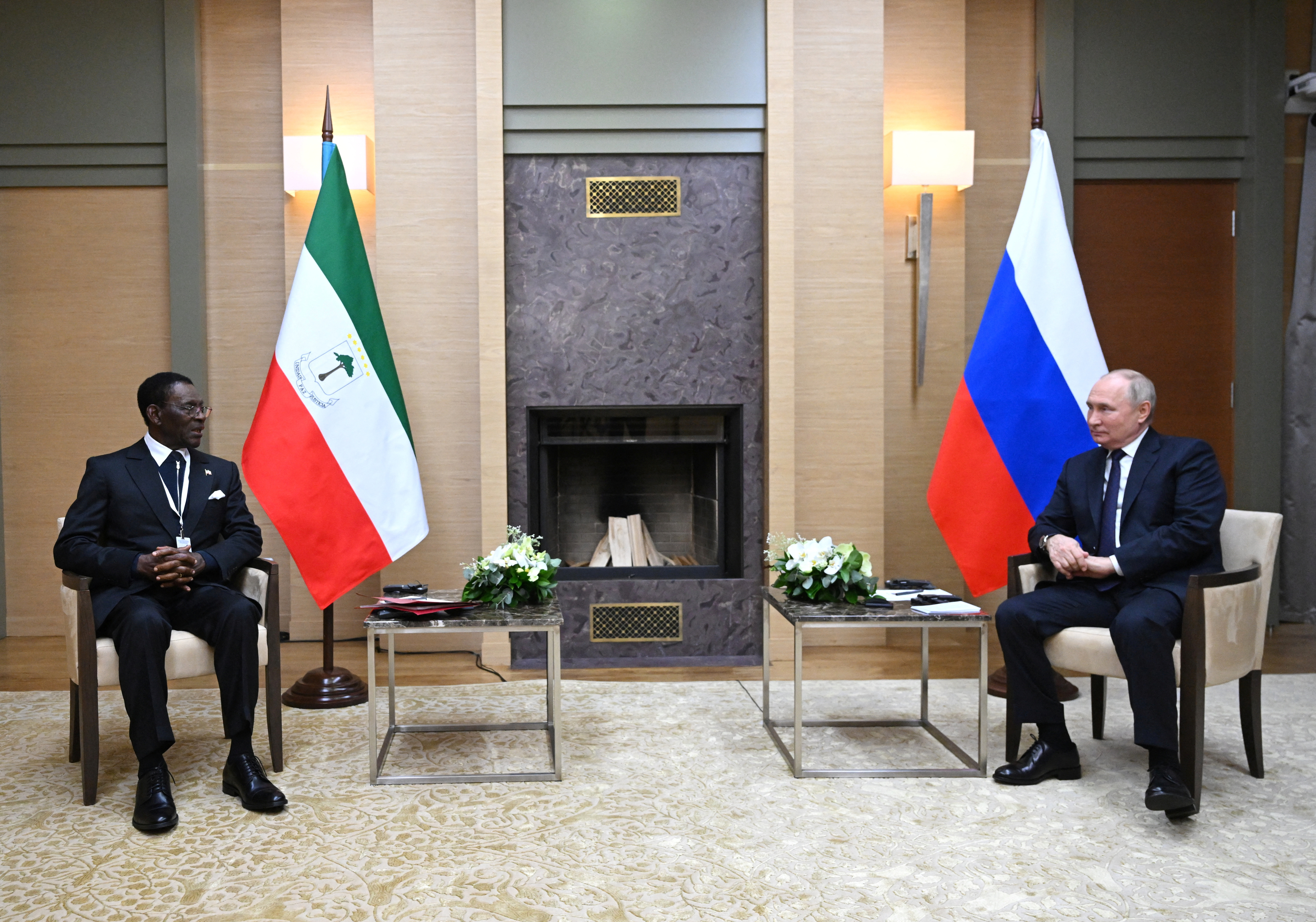 俄罗斯总统弗拉基米尔·普京于2023年11月2日在俄罗斯莫斯科会见赤道几内亚总统特奥多罗·奥比昂·恩圭马·姆巴索戈。卫星社/格里戈里·西索耶夫/池 via 路透社/档案照片