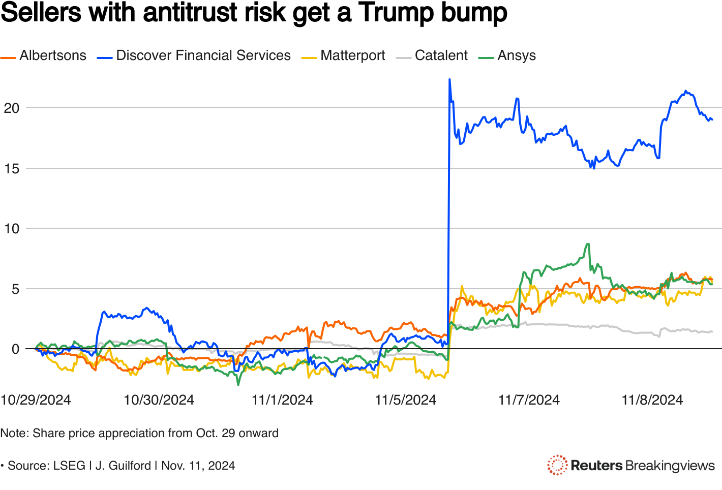 在唐纳德·特朗普赢得11月5日举行的美国总统选举后,多家正在进行收购协议但需接受反垄断机构审查的公司的股价上涨。