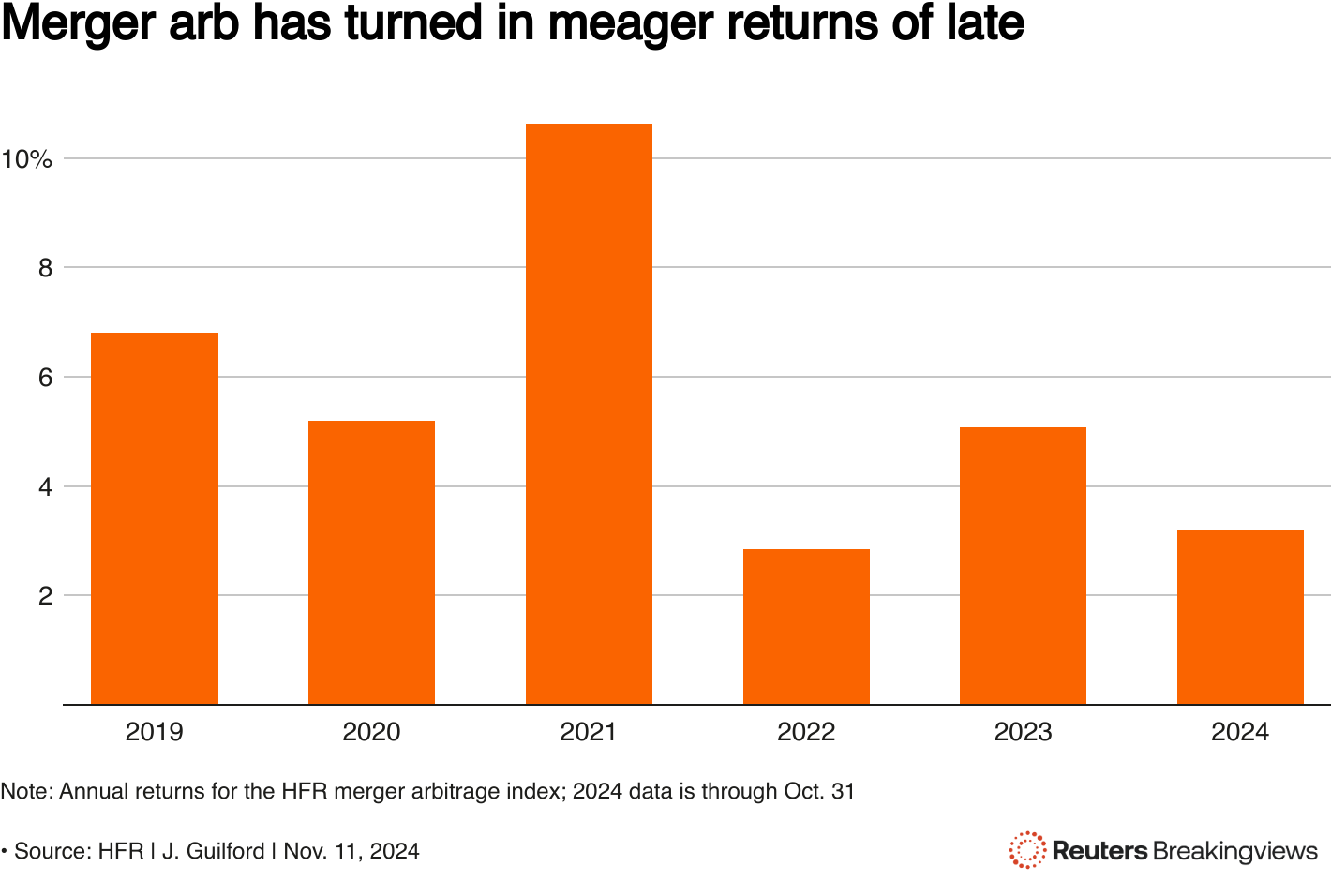 一名交易员在纽约证券交易所(NYSE)旁边的美国国旗下工作,在2024年11月6日,特朗普赢得美国总统选举后,地点在美国纽约市。路透社/安德鲁·凯利纽约,11月12日(路透社Breakingviews)- 合并套利中最大的赌注是糟糕的亏损潮将会结束。试图利用并购命运的对冲基金经理们受到激烈竞争监管者和交易稀缺的打击,无法平衡他们的投资组合。这两种趋势在当选总统特朗普的领导下应该会逆转,但他不可预测的风格意味着更多惊人的糟糕交易在等待着。