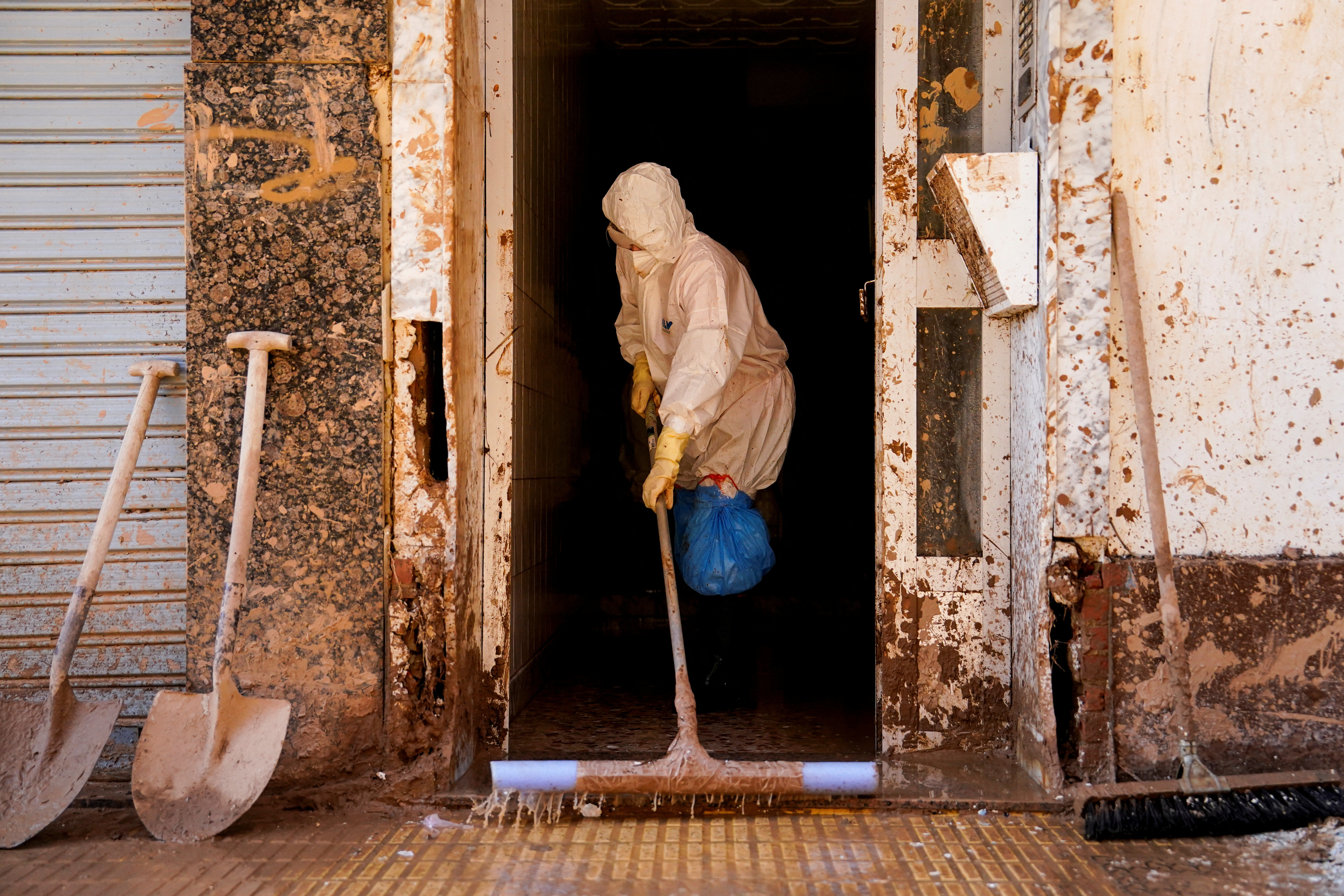 数千名工人正在清理建筑物,同时清除积聚在道路和人行道上的泥土,这些泥土堵塞了瓦伦西亚城市和郊区的排水管道和排水口。