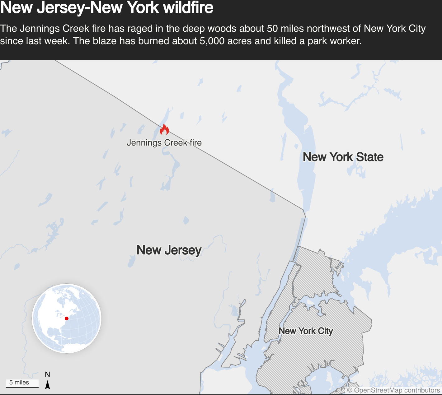 詹宁斯溪火灾自上周以来在距离纽约市约50英里西北的深林中肆虐。火灾已烧毁约5000英亩土地,并导致一名公园工作人员遇难。