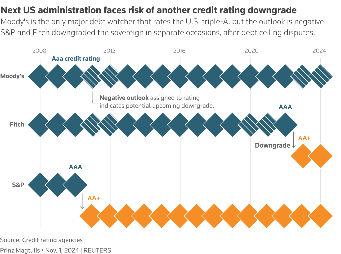 图表显示了从2008年到2024年美国信用评级的三大债务观察机构,惠誉、标准普尔和穆迪的评级情况。