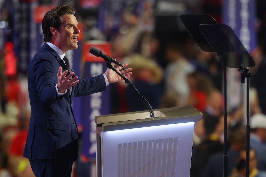 第1项,共2项 代表马特·盖茨(R-FL)在2024年7月17日于美国威斯康星州密尔沃基的菲萨夫论坛(Fiserv Forum)上发言,参加共和党全国大会(RNC)第三天。路透社/布莱恩·斯奈德/档案照片