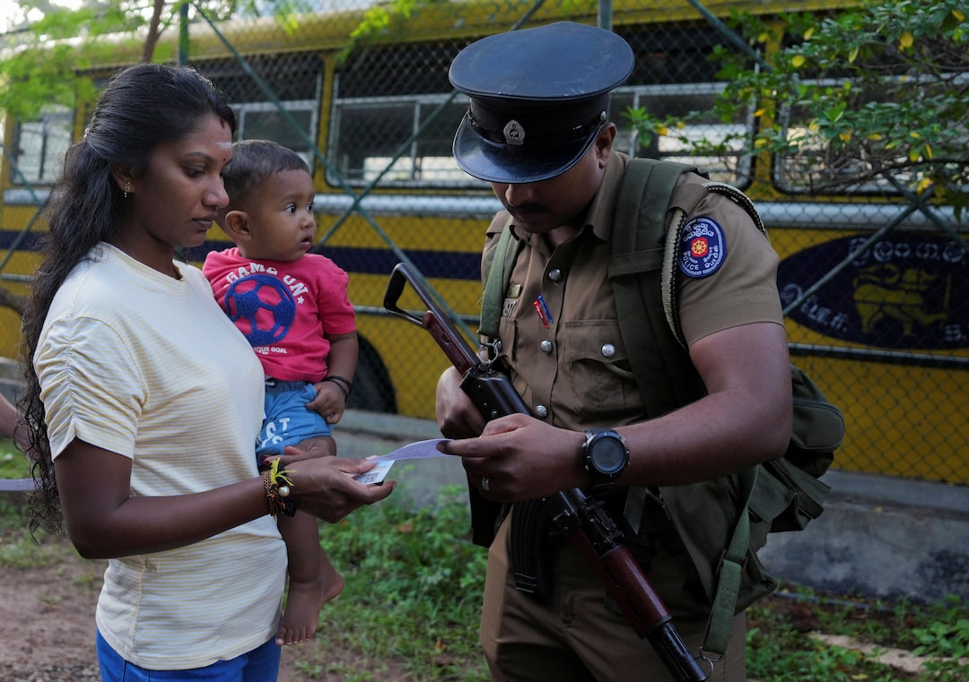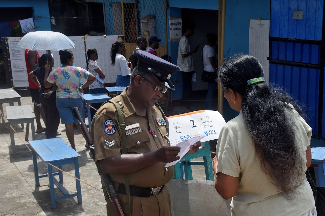 第1项,共5项 一名警察检查一名女性的选民凭证,民众在斯里兰卡科伦坡的议会选举日等待投票,2024年11月14日。路透社/摄影师