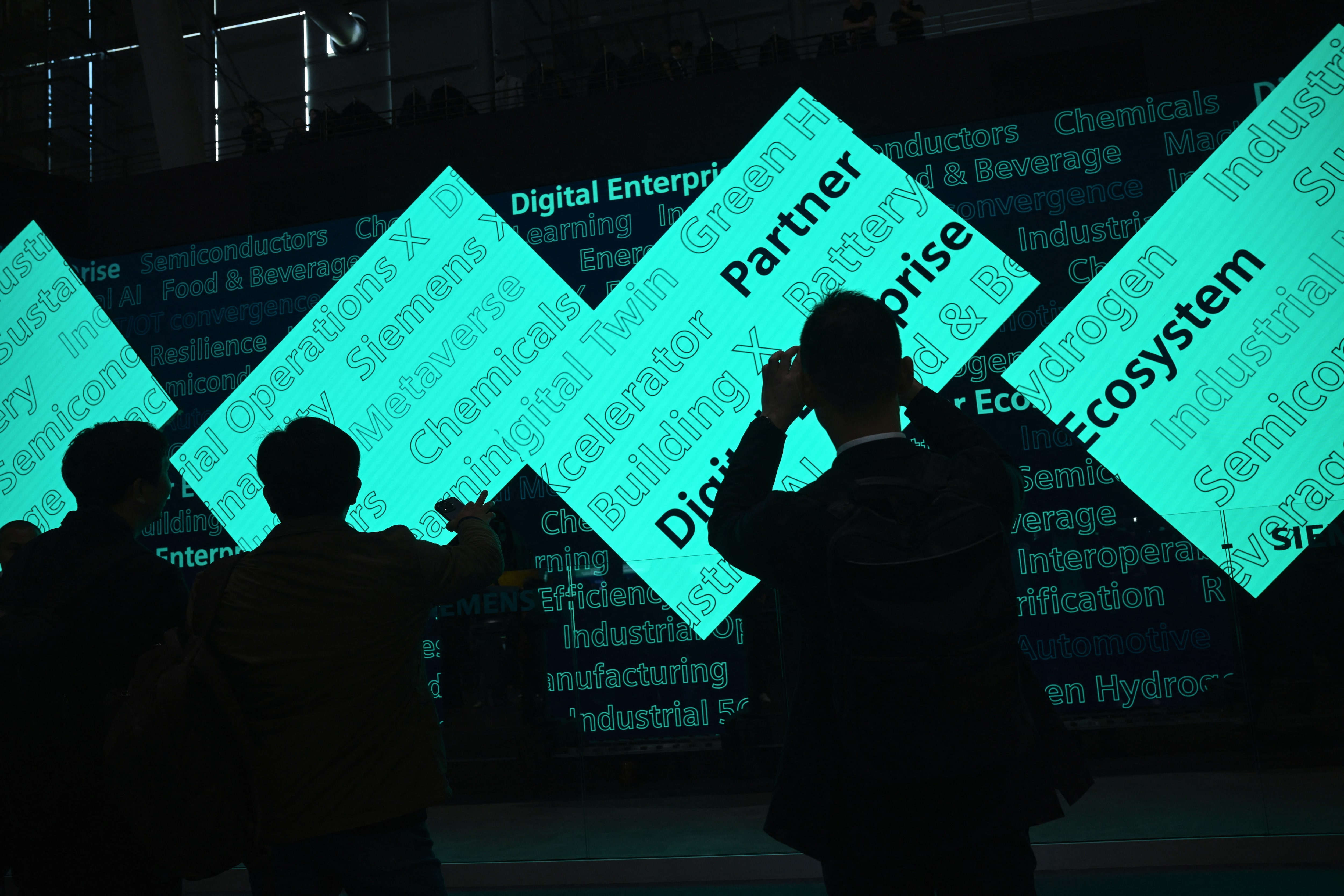 第1项,共2项 人们在德国汉诺威的汉诺威博览会期间观看西门子展台上由机器人手臂移动的屏幕演示,时间为2024年4月22日。路透社/安妮格雷特·希尔斯/档案照片
