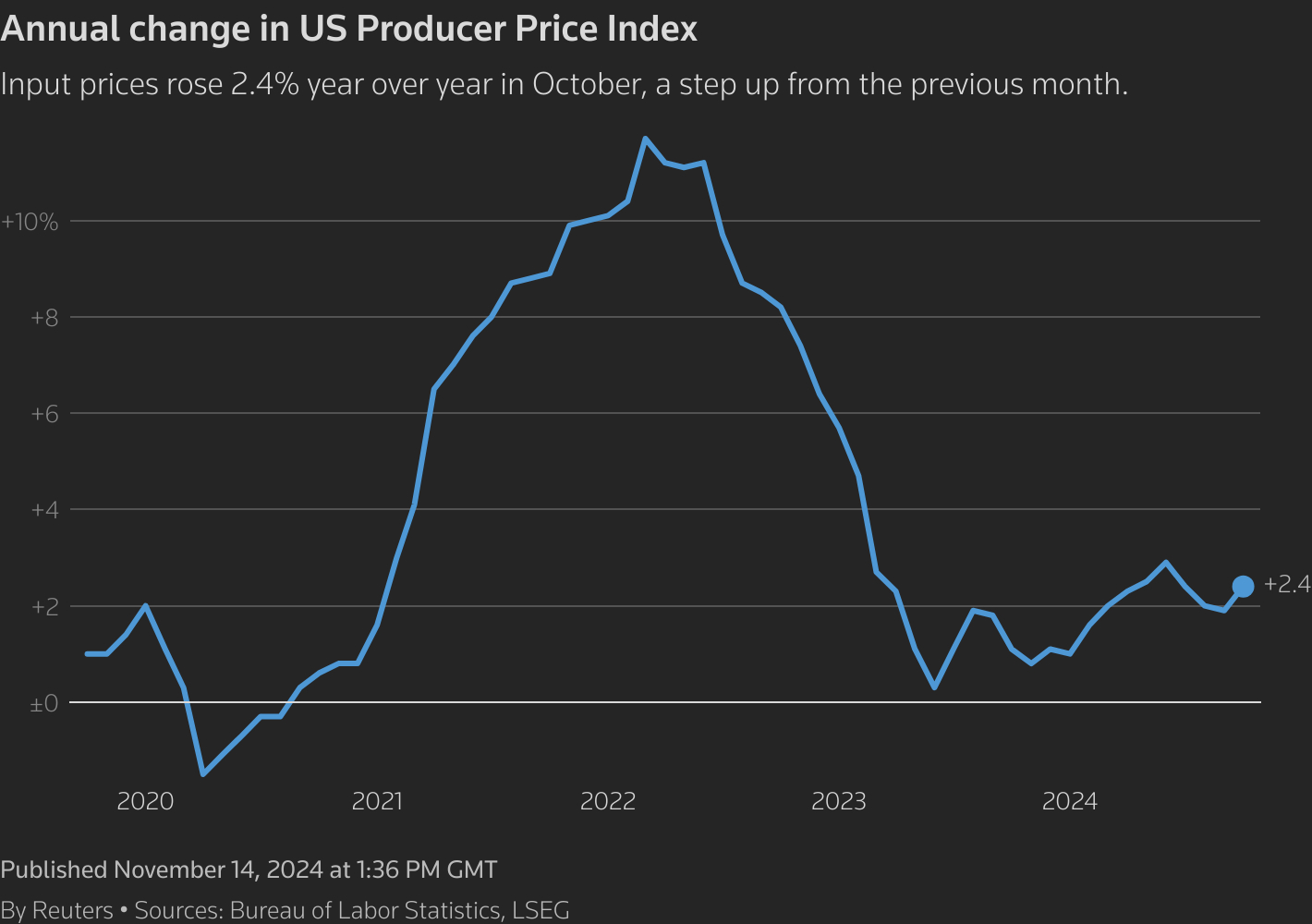 一张标题为“美国生产者价格指数年变化”的折线图,跟踪过去5年的指标。输入价格在10月份同比上涨了2.4%,较上个月有所上升。